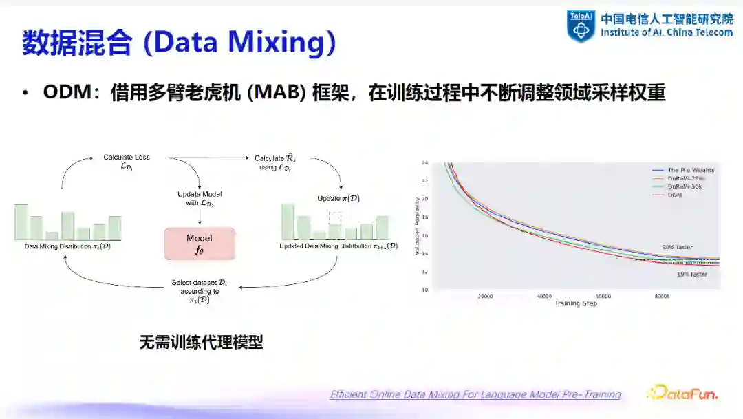 更进一步的方法是利用多臂老虎机(Multi-Armed Bandit)算法在线调整领域采样权重。该算法在强化学习中较为常见,通过模拟拉取老虎机的不同手臂来获得奖励。在预训练模型场景中,大模型可以被视为老虎机,不同的数据集对应不同的手臂。训练过程中,根据获得的奖励(即单个样本的损失)来调整采样权重,以优化整体训练效果。