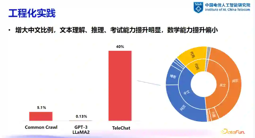 中文数据的重要性:增加中文数据比例可以显著提高模型在文本理解、推理等方面的性能。例如,一些主流开源数据集中,中文数据比例较低,但在国内应用中,增加中文数据比例至 40% 左右,可以使模型在英文评测集上取得优于纯英文数据配比的效果。