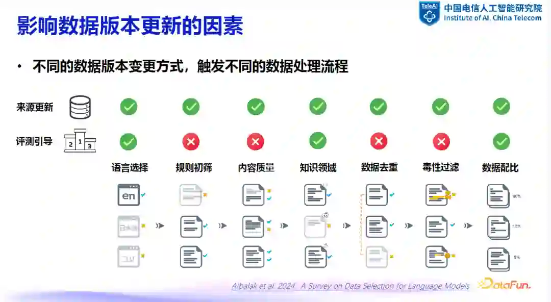 不同的数据版本更新方式会触发不同的数据处理流程。如果数据更新是由数据变化触发的,则可能需要从头到尾进行数据处理的各个步骤;如果是通过评测引导的方法来触发,则只需调整数据配比和领域选择。