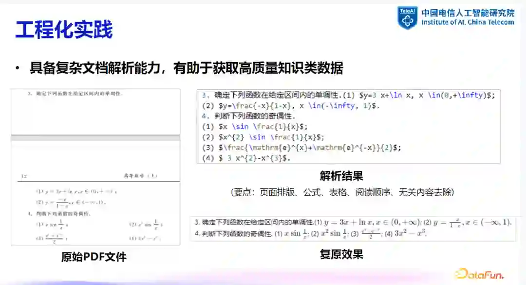 数据处理与解析:在公众化实验中,处理特定类型的数据(如数学题目)时,需要专门的文档解析技术或多模态大模型来提取文本内容。例如,从 PDF 文件中提取公式和表格,需要使用能够处理这些元素的解析器。