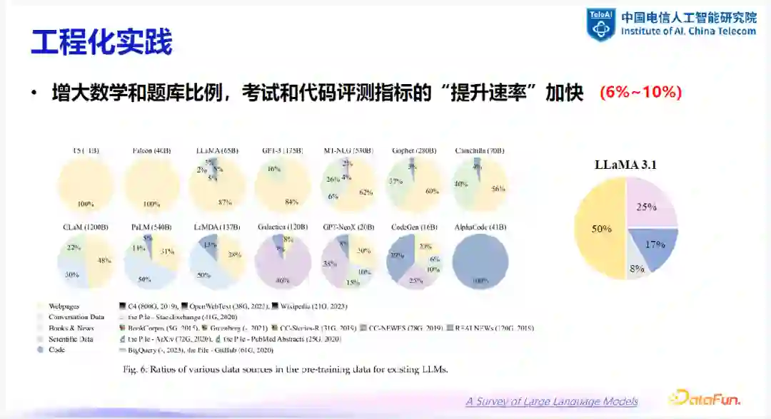 数学与题库数据的重要性:增大数学与题库数据的比例有助于提高考试与代码评测指标的提升速率。例如,最新的 LLaMA3 模型中,数学占比达到 25%,代码占比达到 17%,这表明在训练数据中加入更多数学和编程内容有助于提高模型在这些领域的表现。