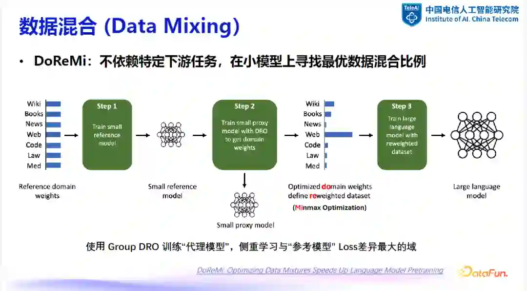 DoReMi 方法是一种不依赖于特定任务的、在小模型上寻找最优数据混合比例的方法。该方法的基本流程如下: