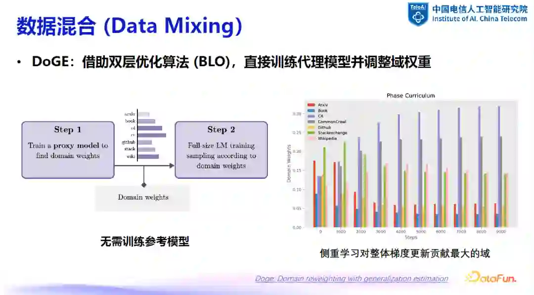 另一种方法是通过双层优化算法直接训练代理模型来调整预训练数据的权重。这种方法的核心在于通过两步更新:第一步更新权重,第二步更新代理模型本身的权重。该算法更侧重于学习对整体梯度贡献较大的领域,即找出哪些领域的样本对代理模型的影响最大。这种方法不需要单独的参考模型,简化了训练流程。
