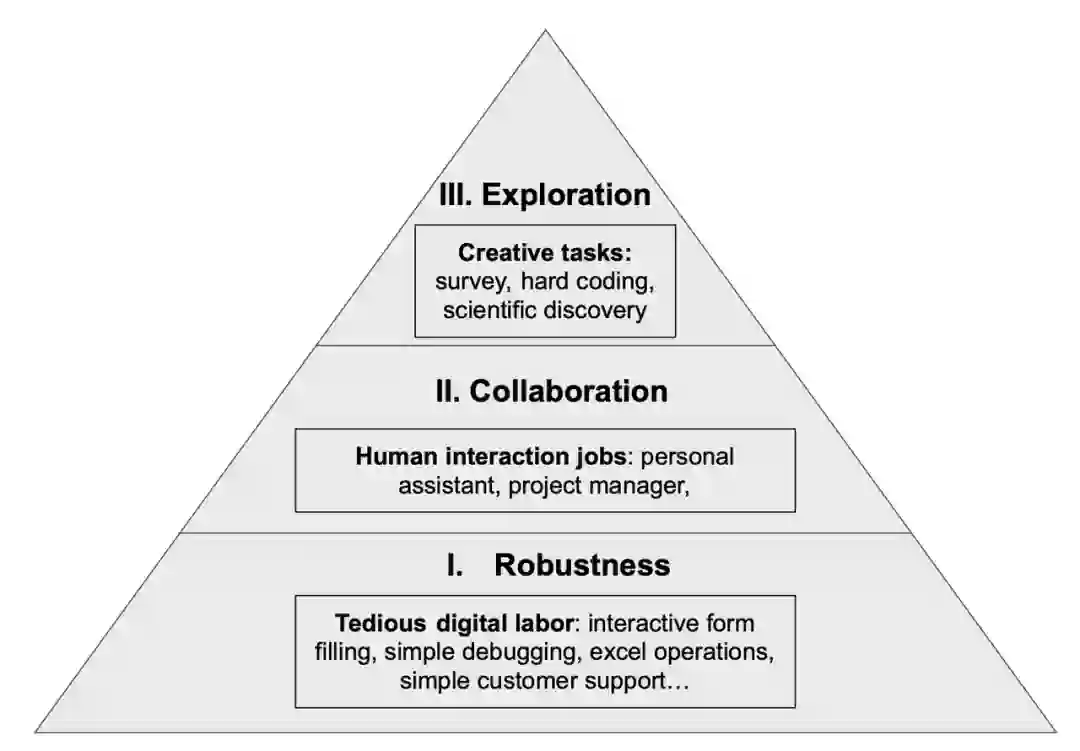 面对无穷无尽的可能性,我们应如何进行分类呢?这似乎并没有唯一的答案,正如人类工作可以从多个维度进行分类或组织一样(薪资水平、工作环境、知识水平、通用与专业等)。在此,我们想提出一个基于智能体能力的三步渐进式阶梯。