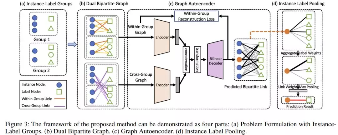 摘要:我们提出了一个实际但有挑战性的问题: 通用部分标签学习(General Partial Label Learning,GPLL)。相比传统的部分标签学习(Partial Label Learning,PLL)问题, GPLL将监督假设从从实例级别(标签集部分标记一个实例)放到了组级别: 1)标签集部分标签了一组实例, 其中组内 instance-label link annotations 丢失, 2)组间的link是允许的——组中的实例可以部分链接到另一个组中的标签集。这种模糊的组级监督在实际场景中更实用,因为不再需要实例级的附加标注,例如,在视频中组由一个帧中的人脸组成,并在相应的标题中使用名称集进行标记,因此不再需要对实例级进行命名。本文提出了一种新的图卷积网络(GCN)——Dual Bipartite Graph Autoencoder (DB-GAE)来解决GPLL的标签模糊问题。首先,我们利用组间的相互关系将实例组表示为dual bipartite图:组内图和组间图,它们相互补充以解决链接的歧义。其次,我们设计了一个GCN自动编码器来对它们进行编码和解码,其中的解码被认为是经过改进的结果。值得注意的是DB-GAE是自监督和转导的,因为它只使用组级的监督,而没有单独的offline训练阶段。对两个真实数据集的大量实验表明,DB-GAEG跟最佳baseline相比有着绝对的提升,0.159 的F1 score和24.8%的accuracy。我们还进一步分析了标签歧义的各个层次。