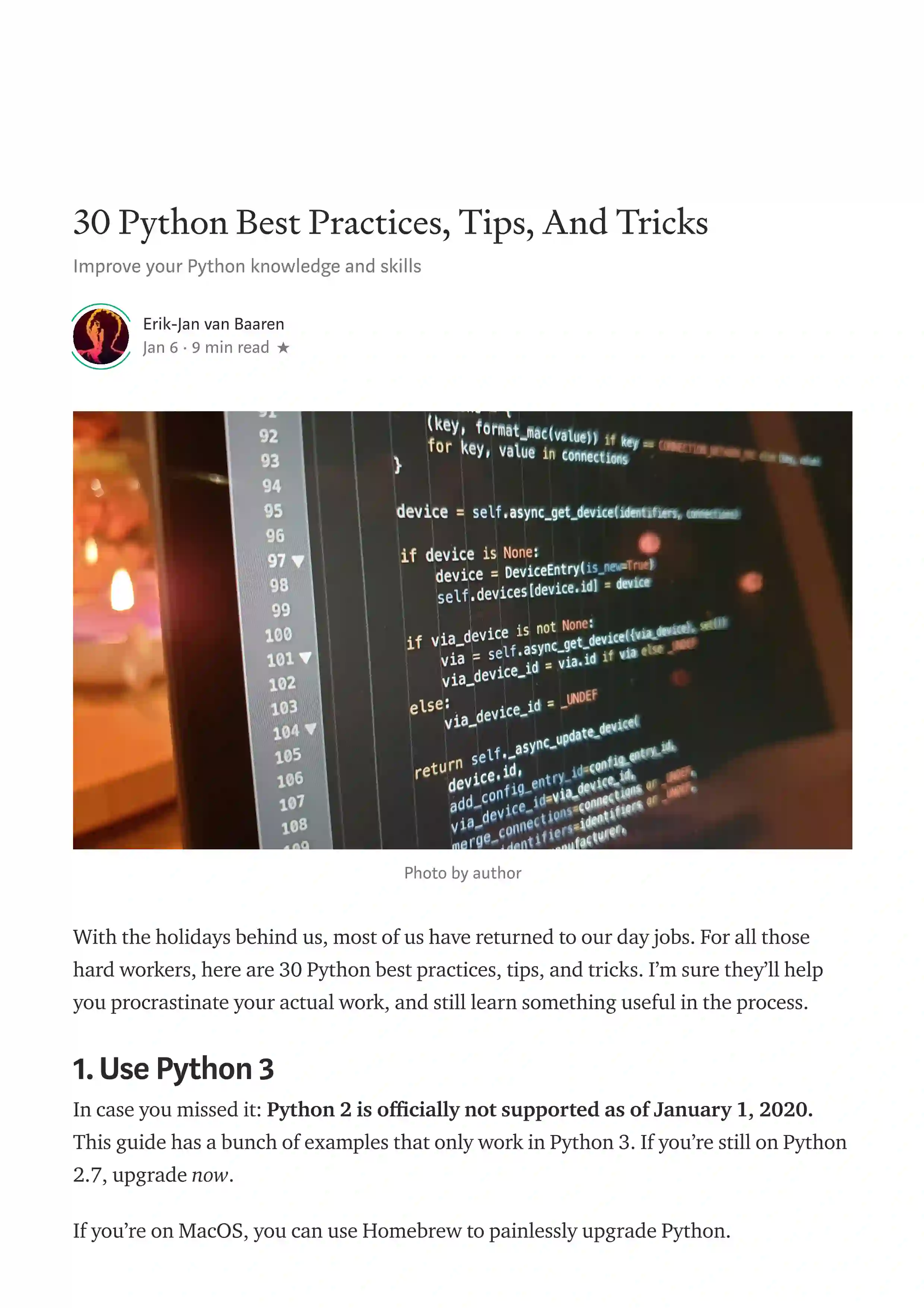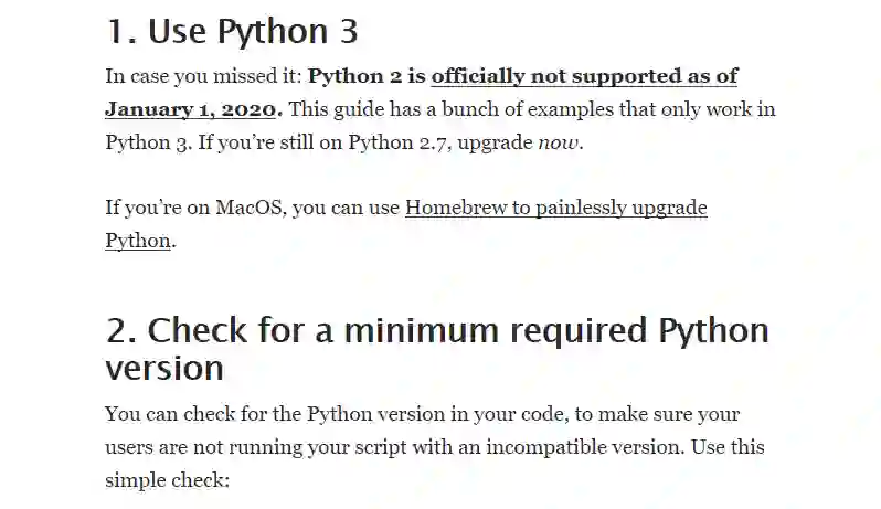 从2020年1月1日开始,正式不支持Python2,如果您还在使用Python2.7版本,现在就升级为Python3吧,本指南中包括很多详细的Python3例子,现在就开始吧。