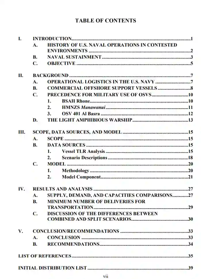 该项目的目的是进行无偏见的研究,以确定基于场景,对弹药和补给的需求的下一代后勤舰(NGLS)的最佳类型和数量。近几十年来,美国海军一直不受常规威胁或来自近似竞争对手的严重竞争的制约。海军作战部长(CNO)和海军陆战队司令(CMC)的指导促使海军部(DON)追求大国竞争,并重新计算军事力量对对手的优势和劣势。这种对创新和能力优势需求的增加提供了新的概念,如分布式海上作战(DMO)、有争议环境下的沿岸作战(LOCE)和远征先进基地作战(EABO)。这些概念改变了美国海军在有争议的环境中使用和分配其部队的方式。战略机动性和战斗后勤部(N42)的人员提出了一个复杂的问题:海军如何才能在后勤上支持和维持这些分布式部队,而又不至于让对舰队的长期维持至关重要的战斗后勤部队(CLF)舰艇承担不必要的风险?本文提供了一个框架,使用转运数学模型来重新武装和补给未来的后勤需求,以支持LOCE、DMO和EABO。