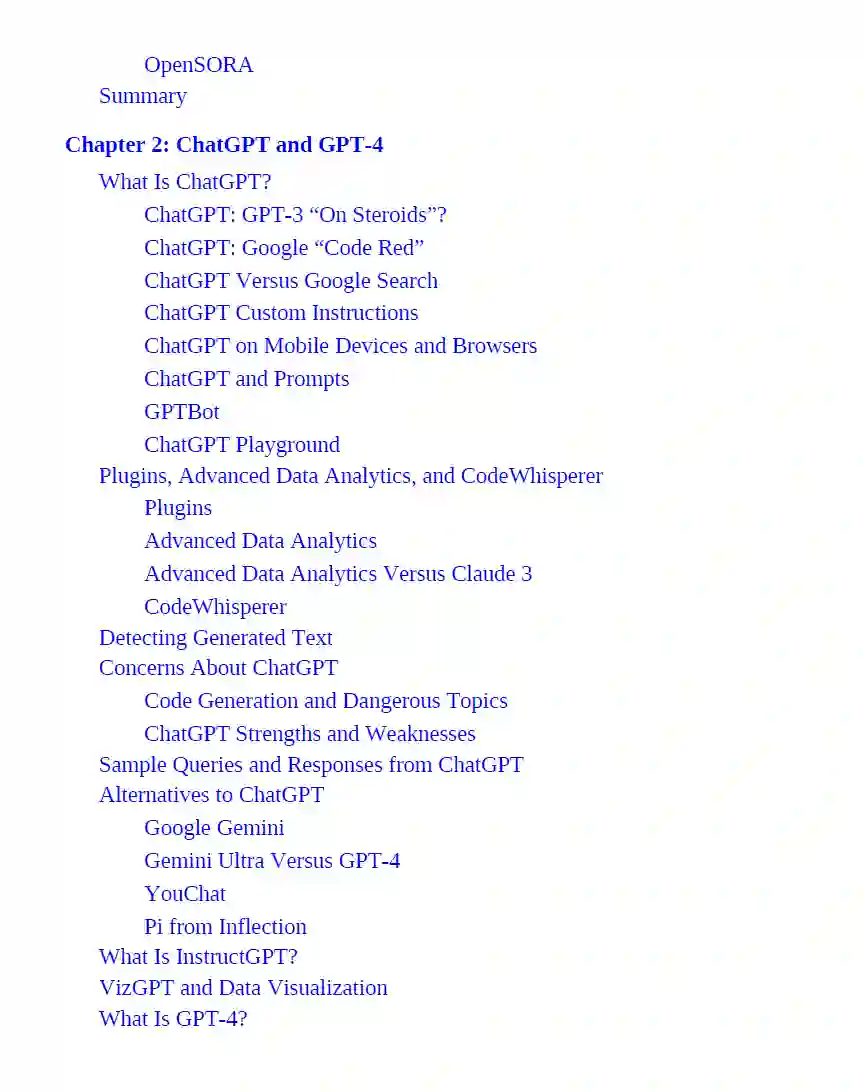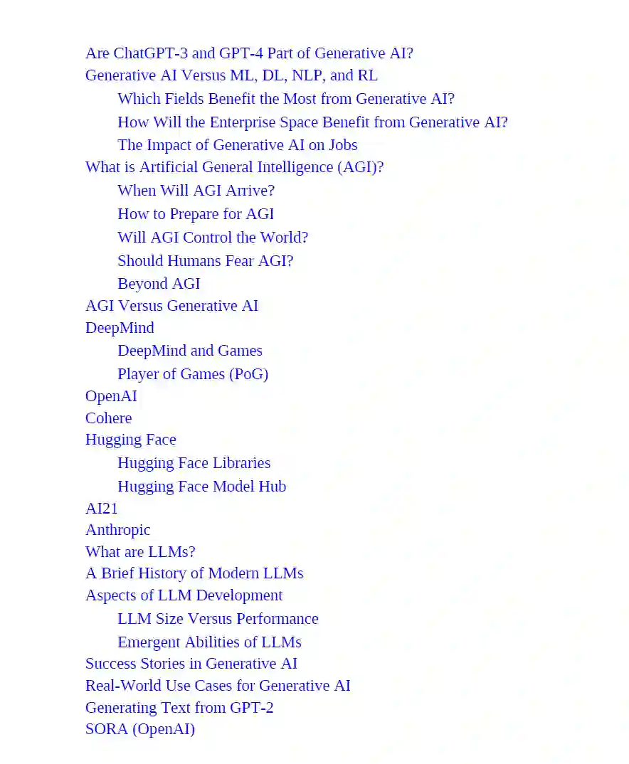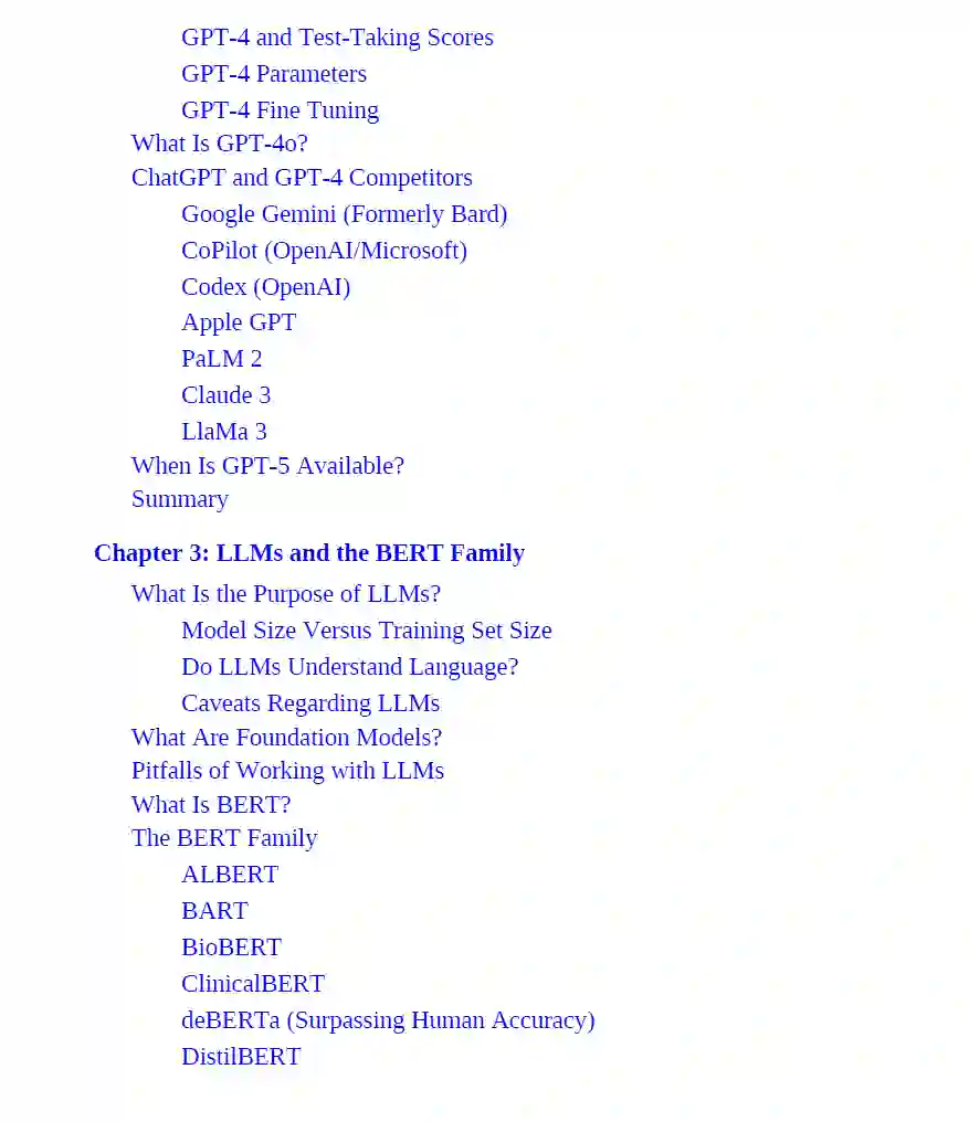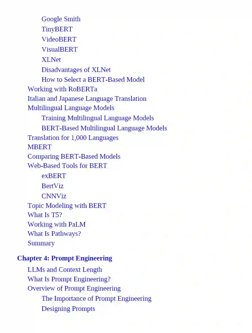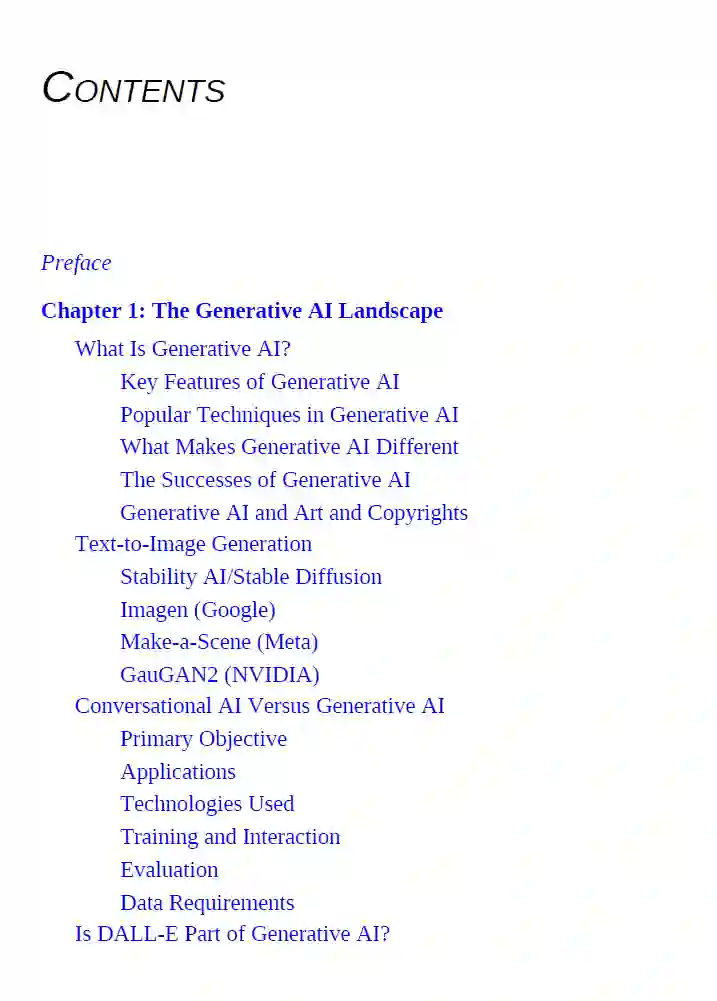 本书首先概述了生成式人工智能的全景,区分了它与对话式人工智能的不同,并介绍了像DeepMind和OpenAI等主要参与者的角色。接着,书中审视了ChatGPT、GPT-4、Meta AI、Claude 3和Gemini的复杂性,探讨了它们的能力、优势及竞争对手。读者还将深入了解BERT系列的大型语言模型(LLM),包括ALBERT、DistilBERT和XLNet,以及这些模型如何彻底改变了自然语言处理。此外,本书还涵盖了提示工程(prompt engineering)技术,这对于优化AI模型的输出至关重要,并探讨了使用LLM时面临的挑战,包括幻觉现象(hallucinations)以及微调这些先进模型的细节。本书专为具有人工智能基础知识的软件开发者、AI研究人员和技术爱好者设计,提供了理论见解和Python中的实用代码示例。读者还可以从出版商处下载伴随文件,包括代码、图示和数据集。特色: