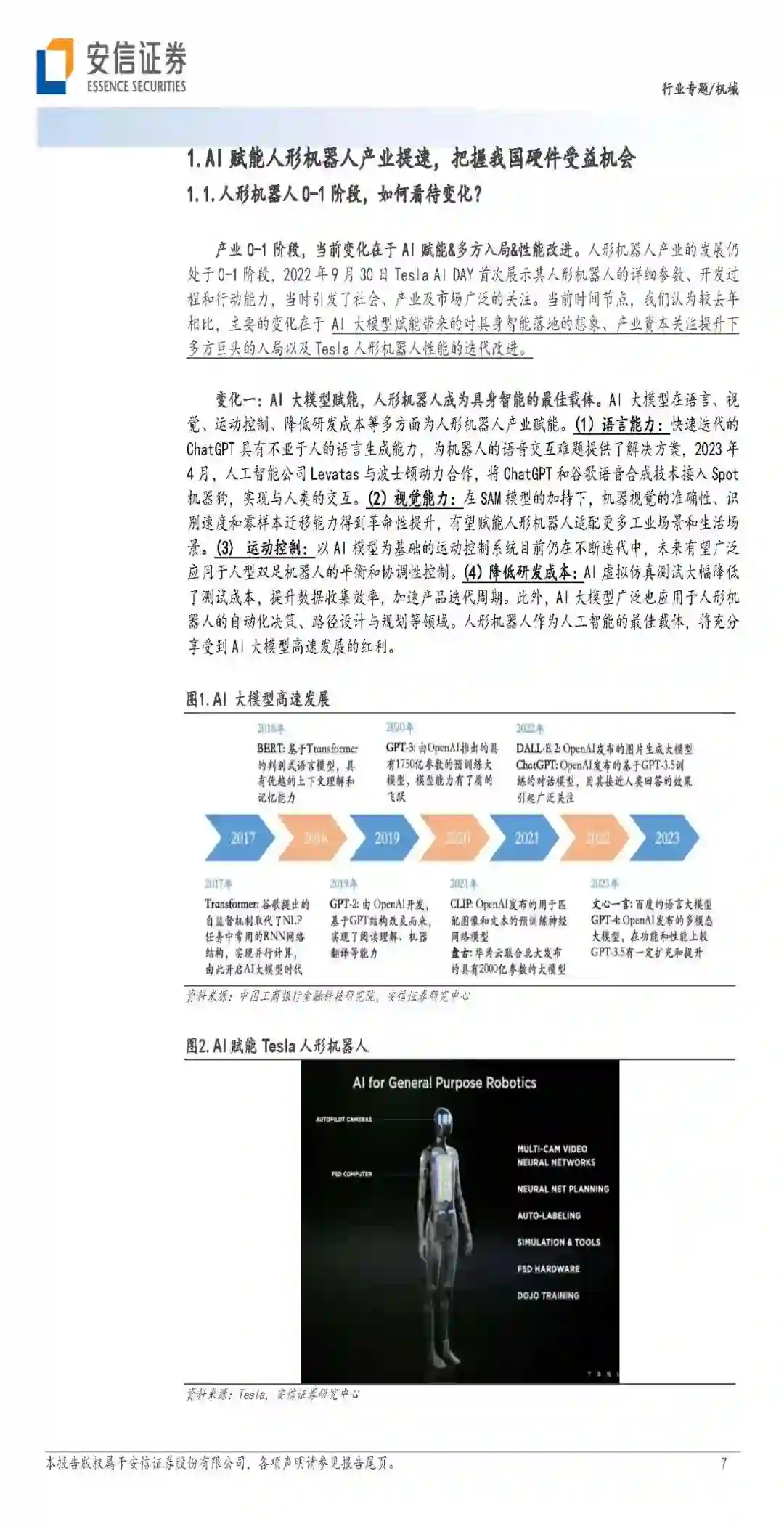 市场边际变化:AI 超预期发展及多方玩家入局, 关注 Tesla AIDAY 等事件催化。我们认为 2023 年相对于 2022 年而言,市场最大的边际变化在于:一方面,人形机器人是 AI+机械的最大落地场景, ChatGPT 接入机器人,有望使得人机互动更加智能,更多元化,产业落地有望加速。另一方面,全球范围内兴起人形机器人热潮, 特斯拉、波士顿动力、 Engineered Arts、 1X Technologies、优必选、达闼、小米、 傅利叶智能等海内外企业纷纷入局,风投企业软银集团创始人孙正义亦在今年 6 月股东大会中表示出对 AI革命的强烈兴趣。展望未来,我们认为短期可以重点关注今年 7月傅利叶智能的新品发布会及 9 月 Tesla AI DAY,长期需要跟踪人形机器人于明后两年的量产进度。 市场空间判断:成长性明确,长期价值有望超过电动车。据高盛预测, 在技术得到革命性突破的理想情况下人形机器人 2025-2035 年销量 CAGR 可达 94%, 2035 年市场规模达 1540 亿美元。若参照电动汽车发展历程,则乐观情况下人形机器人 2025-2035 年销量 CAGR 可达 59%。从劳动力替代角度来看,人形机器人在两年投资回报期情形下将逐步实现从 B 端至 C 端的量产推广。TeslaCEO 马斯克在今年 5 月股东大会中指出长期维度人形机器人价值将超过电动车。