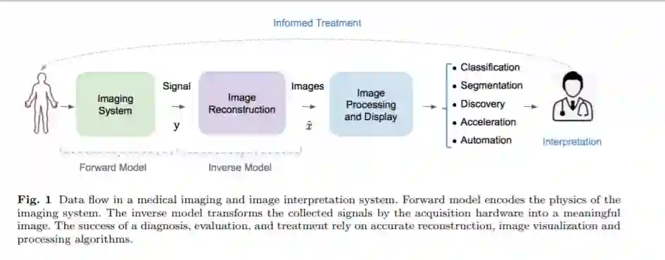 医学影像是一种宝贵的医学资源,因为它可以窥探人体内部,为科学家和医生提供丰富的信息,这些信息对于理解、建模、诊断和治疗疾病是必不可少的。重建算法需要将采集硬件收集的信号转换成可解释的图像。考虑到问题的病态性和实际应用中缺乏精确的解析反变换,重构是一项具有挑战性的任务。而最后几十年目睹了令人印象深刻的进步的新形式,提高时间和空间分辨率,降低成本和更广泛的适用性,几个改进仍然可以设想,如减少采集和重建时间以减少病人的辐射和不适,同时增加诊所吞吐量和重建精度。此外,在小功率手持设备中部署生物医学成像需要在准确性和延迟之间取得良好的平衡。