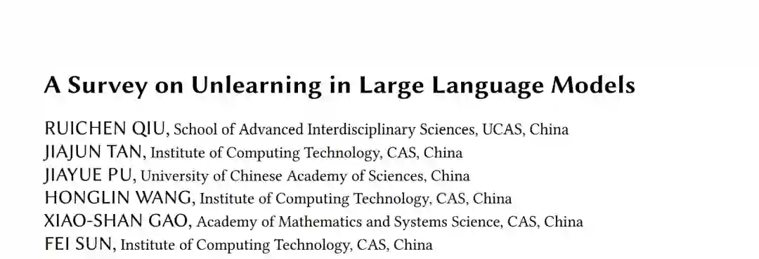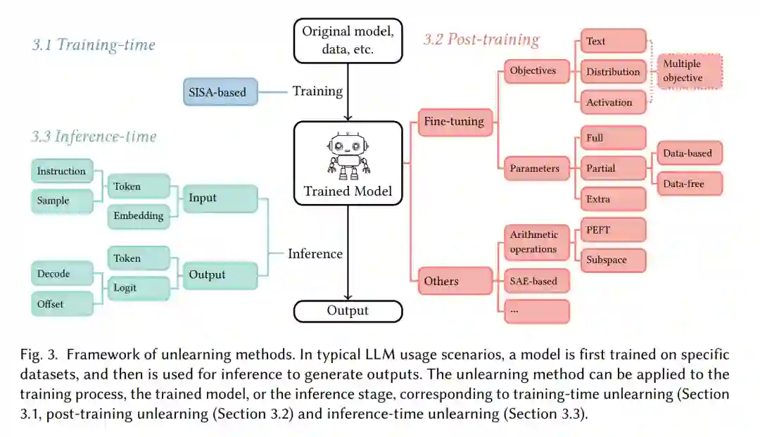 大型语言模型(Large Language Models, LLMs)的发展极大地推动了自然语言处理的进步,但其在大规模语料上的训练也带来了显著风险,包括敏感个人数据的记忆化、受版权保护内容的泄漏,以及可能助长恶意行为的知识。为缓解这些问题,并遵循诸如“被遗忘权(right to be forgotten)”等法律与伦理规范,机器遗忘(machine unlearning)被提出,作为一种关键技术,旨在选择性地从LLM中移除特定知识,同时不损害模型的整体性能。 本综述系统回顾了自2021年以来发表的180余篇关于LLM遗忘的研究工作,聚焦于大规模生成式模型。与以往的综述不同,我们提出了针对遗忘方法与评测体系的全新分类框架。具体而言,本文将现有方法明确划分为三大类: * 训练阶段遗忘(training-time unlearning), * 后训练阶段遗忘(post-training unlearning), * 推理阶段遗忘(inference-time unlearning), 根据遗忘操作介入模型生命周期的不同阶段进行区分。