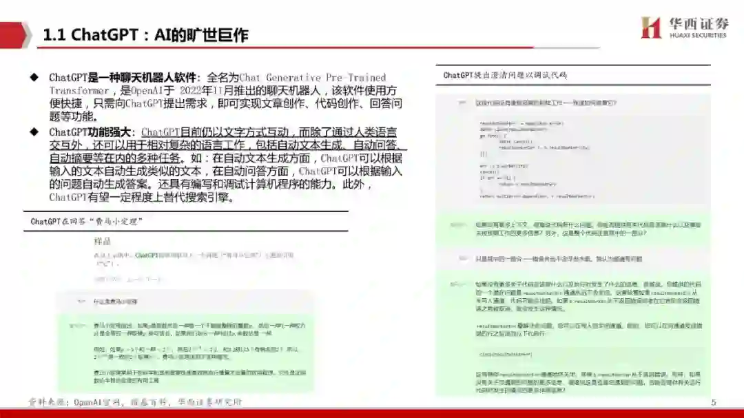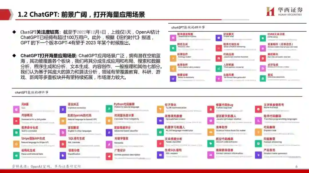 ChatGPT,人工智能的旷世巨作。ChatGPT是一种聊天机器人软件,OpenAI于2022年11月推出的聊天机器人,具备人类语言交互外复杂的语言工作,包括自动文本生成、自动问答、自动摘要等多重功能,应用场景广阔,相较于上个版本更像人类一样聊天交流。OpenAI除了ChatGPT还包括Dall·E2、Whisper等项目分别是自动绘图、自然语言翻译等软件。OpenAI的商业模式即API接口收费,可根据不同项目需求进行收费,我们认为其商业模式属于底层模型开放性标准化SAAS服务模式。我国仍处于初期阶段,以辅助生成内容服务为主,我们认为未来有望形成相关SAAS模式。