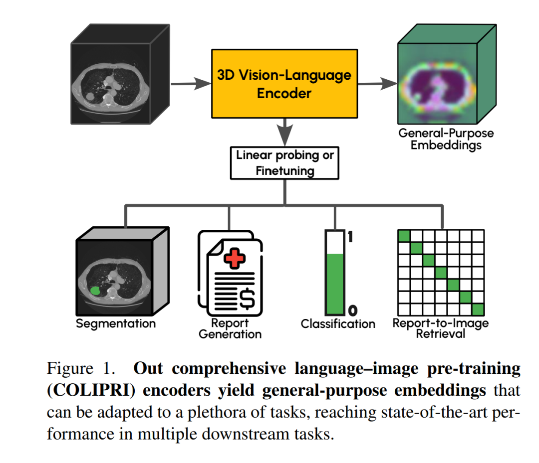 视觉–语言预训练(Vision–Language Pre-training),即通过对齐图像与配对文本,是一种强大的范式,可用于直接构建可执行分类与检索任务的编码器(encoder),并可进一步应用于分割与报告生成等下游任务。在三维医学影像领域,这类能力使视觉–语言编码器(Vision–Language Encoders,VLEs)能够辅助放射科医生完成诸如检索具有相似异常特征的患者或预测异常概率等任务。尽管这一方法论前景广阔,但当前三维 VLE 的能力仍受到数据可用性的限制。 在本文中,我们通过引入额外的归纳偏置(inductive biases)来缓解数据稀缺的问题:提出了报告生成目标,并将视觉–语言预训练与仅视觉预训练相结合。这一设计使我们能够同时利用仅含图像的数据集和图像–文本配对的三维数据集,从而显著增加模型可接触的训练数据量。借助这些额外的归纳偏置,并结合三维医学影像领域的最佳实践,我们提出了综合语言–图像预训练(Comprehensive Language–Image Pre-trained, COLIPRI)编码器系列。我们的 COLIPRI 编码器在报告生成、分类探测(classification probing)和零样本分类(zero-shot classification)等任务上均达到了最新的性能水平,并在语义分割任务上保持了具有竞争力的表现。1. 引言 对比式语言–图像预训练(Contrastive Language–Image Pre-training,CLIP)[31] 已经成为学习通用图像与文本表征的最强范式之一。除了作为适应下游任务 [11, 23] 的强大起点外,语言对齐的视觉嵌入还能使模型利用自然语言执行开放集分类 [31] 与开放集分割 [55]。