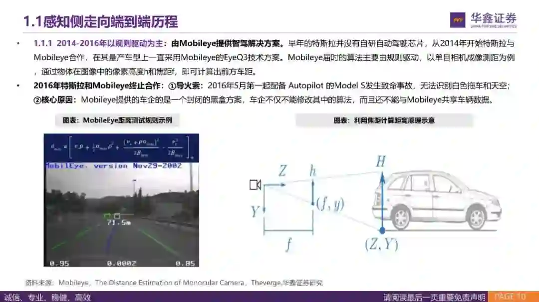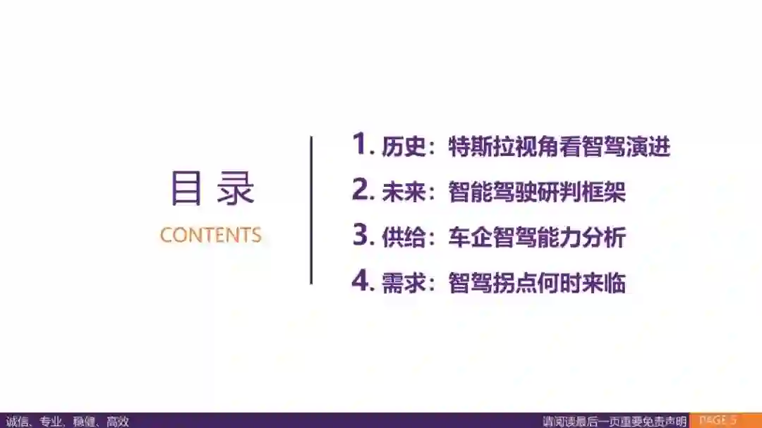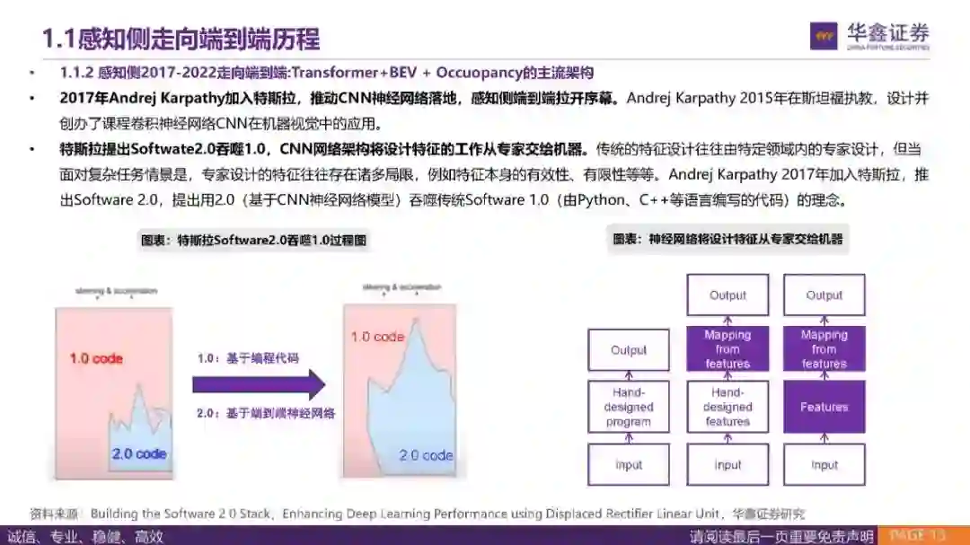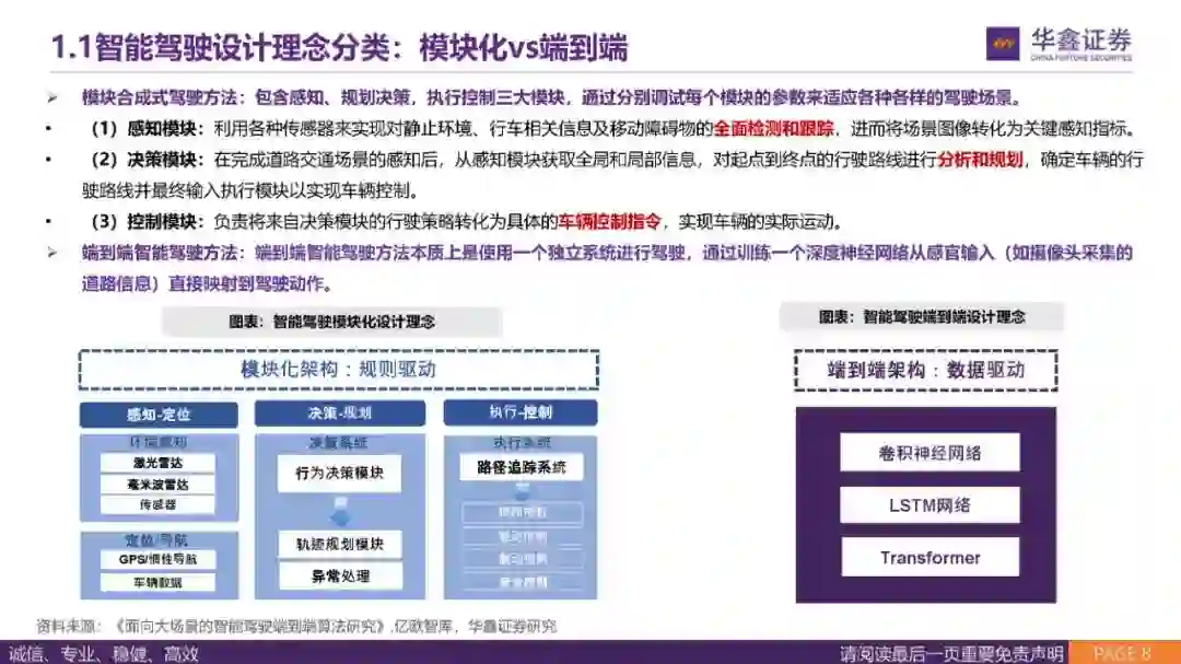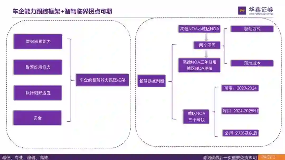 第一章:回顾历史**,智能驾驶的核心主线是算法的演进史,从2017年至今,在感知侧+规控侧实现算法从规则为主走向端到端**。算法方面,2017-2022年,特斯拉在感知侧走向端到端,实现BEV+Transformer+Occupancy。2021-2023年,特斯拉在规控侧从规则走向端到端。数据闭环方面,特斯拉在2022年实现模拟仿真数据、自动标注、云端算力等三个方面的升级。硬件方面,特斯拉从HW1.0升级至HW4.0,期间通过算法升级+自研FSD芯片,实现更为适配智能驾驶进化的硬件体现。 ** 第二章:展望未来,我们认为智能驾驶的算法将走向收敛,核心主线将从算法走向数据闭环**。向未来看,我们提出由算法+数据闭环+硬件降本+政策法规四个维度构成的研究框架。围绕这些角度展开,我们提出未来智能驾驶核心的三个趋势:数据竞赛+大模型+任务导向。 第三章:对国内智驾能力的区分,我们提炼四个维度:数据积累能力+智驾好用能力+安全性+舒适性。基于数据闭环(背后竞争要素对应为组织的工程化能力)成为未来核心分水岭,我们认为基于算法来判断各车企领先程度的意义将愈发有限,以对数据为主的跟踪将成为未来判断各车企竞争水平的重要指标。 第四章:智驾下半场是城区NOA,智驾有望在2025H1迎来“好用”拐点。