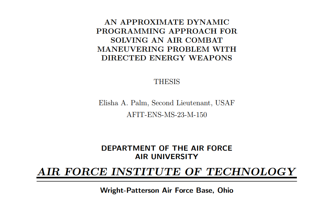 在视距(WVR)内进行空战需要执行复杂的空中机动和快速的顺序决策。如果加入额外的武器能力,这些决策的复杂性还会进一步增加。无人自主飞行器技术和武器能力的发展有助于克服人为限制带来的障碍。事实证明,自主无人作战飞行器(AUCAV)和定向能武器(DEWs)等先进武器能力在 WVR 空战中至关重要。这就引出了一个问题--AUCAV 能否拥有适当的人工智能和武器能力,以改进高质量的空战演习和战术?为了研究这个问题,本文提出并解决了广义空战机动问题(ACMP),在这个问题中,通过建模来控制一架防御型 AUCAV,该 AUCAV 正在寻求与攻击型敌机交战。该模型利用每架飞机的 5 自由度点质量来跟踪其状态转换,同时还跟踪内部携带的火炮和 DEW 能力。由于该问题的维度较高,提出了一种近似动态规划(ADP)方法,其中开发了一种近似策略迭代算法。这种 ADP 算法通过神经网络回归来实现高质量的战斗机战术和机动。计算实验结果表明,在 3 个问题实例中,有 2 个实例的 ADP 策略优于所有 3 个基准策略。ADP 策略学会了同时使用内部携带的火炮和 DEW,这促进了 ACMP 中任一武器平台的态势效益理念。在 WVR-ACMP 中加入 DEW 功能可以体现前所未有的空战战术。