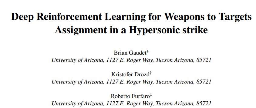 在本手稿中,我们展示了深度强化学习(RL)可用于学习有效的 WTA 策略,该策略可实时计算(几毫秒)。这为动态 WTA 提供了可能性,即在终端阶段定期更新 WTA。例如,如果分配给高价值目标的 HSW 在交战早期被拦截,那么分配给低价值目标的 HSW 可能有一条通往高价值目标的可行轨迹,并可转向替换被摧毁的 HSW。我们对 WTA 采用 RL 方法的另一个优势是,计算时间与 HSW 和目标数量近似线性缩放。在之前的工作[2, 9-16]中,我们已经证明 RL 和元强化学习都能成功应用于航空航天制导、导航和控制问题。据我们所知,这项工作是首次将 RL 应用于 WTA 问题,它使用了卷积网络(CNN)[17] 前端,将性能与最优基准进行了比较,解决了高超音速打击应用问题,并且兼容不同数量的 HSW 和目标。本文的其余部分安排如下。第二节阐述了 WTA 问题,第三节介绍了开发 NLIP 基准 WTA 和 RL WTA 所使用的方法,第四节比较了 NLIP WTA、RL WTA 和快速运行的简单启发式 WTA 的性能。第六节给出了结论和未来工作。