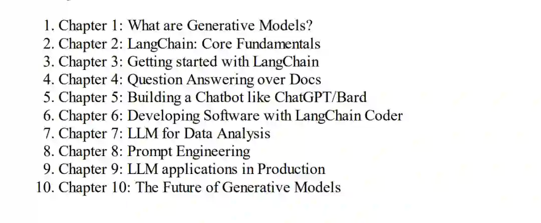 本书适用于: 本书适用于开发人员、研究人员和任何对LLMs感兴趣的人。本书风格清晰简洁,包括大量代码示例,帮助读者通过实践学习。无论您是初学者还是经验丰富的开发人员,这本书都将成为任何希望充分利用LLMs并希望在LLMs和LangChain领域保持领先地位的人的宝贵资源。需要基本的Python知识,而之前接触过机器学习将帮助您更轻松地跟随。 https://www.oreilly.com/library/view/generative-ai-with/9781835083468/