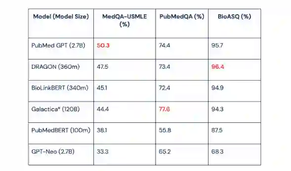 同时开发者将结果与5个模型进行了比较(如上图):DRAGON、GPT-Neo 2.7B、Galactica、BioLinkBERT、PubMedBERT。结果证明: