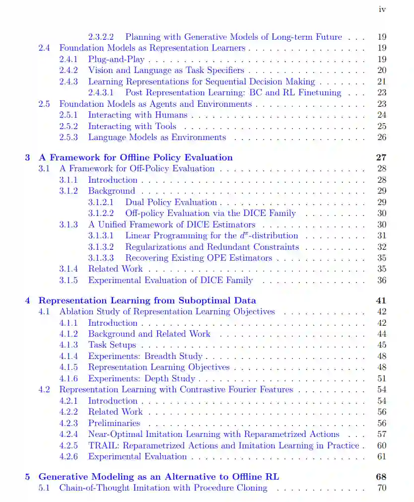 AlphaGo和ChatGPT可能是过去十年中人工智能领域最重要的两项突破。这些技术得益于在序列决策(例如,规划、搜索和强化学习)以及基础模型(例如,基于互联网数据训练的语言和视频生成模型)方面的研究。本论文提出了在现实世界决策任务背景下,利用具有广泛知识的基础模型的新技术、算法和框架,这些研究将影响对话代理的构建、机器人控制和科学发现等应用。本论文从离线环境中的传统决策制定开始,逐步通过表示学习和生成建模引入更广泛的互联网规模数据。论文强调了理论基础与实际应用的结合。本论文的主要贡献包括离线强化学习的算法进步、面向决策制定的表示学习改进、作为强化学习替代的全新生成建模技术,以及基于互联网规模的生成代理和生成模拟器,所有这些都旨在增强基础模型的决策能力,并使之相辅相成。通过广泛的实证和理论分析,本论文表明,基础模型在得到适当利用时,可以显著提高决策任务的效果。这些发现为将机器学习模型与现实世界应用整合提供了新的方向,为更智能、适应性更强、效率更高的系统铺平了道路。 在过去的十年中,人工智能(AI)领域的两项重要突破包括2016年人工智能围棋玩家AlphaGo击败人类选手李世乭 [21],以及2022年部署的人工智能聊天机器人ChatGPT [22]。这些技术进步得益于在序列决策和基础模型方面的研究。在序列决策中,目标是让计算机(代理)自动决定一系列动作(例如,在哪里放置围棋子),并且让计算机基于来自环境的反馈(例如围棋比赛的结果)自动改进这些决策。机器学习在序列决策中的方法涉及训练决策策略,即基于当前观测(例如围棋棋盘)选择动作的策略,通过试验和错误的方式进行训练。这种方法在环境支持无限访问的游戏场景中表现良好,但在现实世界中超越游戏场景的规模时却难以实现,因为在现实环境中无限访问是不切实际的。即使在游戏场景中,先前在序列决策中的工作大多集中在任务特定或“白板”设置中,缺乏先验知识 [23]。因此,先前的序列决策工作在泛化和样本效率方面通常表现不佳,例如解决单个Atari游戏需要7个GPU天的交互游戏时间 [24]。 最近,基础模型(定义为使用自监督学习在大规模数据上训练的大型机器学习模型 [25])在互联网上的大量数据上进行了训练。例如,自回归语言模型 [26, 27]通过从互联网抓取的文本数据来预测给定前述单词(标记)后的下一个单词(标记)。类似地,视频生成模型 [28, 29]通过从互联网抓取的视频数据,在给定语言输入和/或前述帧的情况下,预测下一帧。因此,这些模型能够生成高度逼真的自然语言和视频。然而,模仿互联网内容并不是这些模型的最终目标。这些模型的最终目标是解决现实世界中的任务,如回答人们的问题和模拟现实世界的交互。为了实现这一目标,这些模型生成的内容必须由人类控制。如何引导这些模型根据用户反馈生成理想的内容,以及如何使这些模型做出一系列决策以完成某些复杂任务(例如构建网站),是序列决策的核心问题。将基础模型研究和序列决策研究结合起来具有巨大的优势。一方面,基础模型中的广泛知识可以提高决策算法的样本效率和泛化能力。另一方面,决策算法可以对原本与任务无关的基础模型进行任务特定的优化。本论文研究了基础模型在决策制定中的技术、框架和算法,并展示了如何将基础模型中的广泛知识有效转化为任务特定的决策,以更好地解决广泛的问题和应用。 本论文通过从传统的决策制定技术开始,研究在离线数据集设置下的基础模型在决策制定中的应用,随后逐步引入更广泛的数据,最终整合互联网规模的视觉和语言数据。我们将对利用基础模型解决序列决策问题的理论方面和实际应用方面给予高度关注。本论文的工作基于先前关于序列决策的研究思想,但新提出的方法展示了更高的全面性和可扩展性。 本章的其余部分组织如下。第1.1节介绍了基础模型,这是一种在互联网规模数据上训练的机器学习模型。本节讨论了训练基础模型的常见技术,包括表示学习和生成建模。随后描述了基础模型的局限性,包括指令遵循、长时间推理、多步骤规划和多模态处理。然后概述了本论文如何通过结合决策制定技术来应对其中的一些挑战。第1.2节描述了序列决策的典型设置和常见的决策制定算法,包括模仿学习、强化学习、搜索和规划。接下来,本节重点介绍了序列决策的主要瓶颈,包括样本效率和缺乏良好的视觉和文本表示。最后,简要介绍了本论文如何通过结合基础模型来应对这些挑战。第1.3节阐述了本论文的贡献,并总结了其结构。