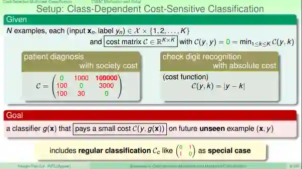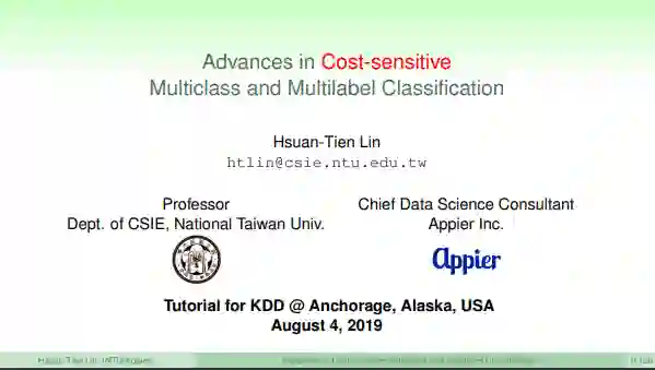 分类是数据挖掘和知识发现中的一个重要问题。传统上,规则分类问题的目的是最小化误预测的错误率。然而,现实世界中的许多数据挖掘应用程序需要不同的成本来处理不同类型的mis分类错误。例如,误将革兰氏阳性菌归类为革兰氏阴性菌会导致完全无效的治疗,因此比误将革兰氏阳性菌归类为另一革兰氏阳性菌更为严重。这种对成本敏感的分类问题与常规分类问题有很大的不同,可以应用于目标营销、信息检索、医疗决策、目标识别和入侵检测等领域。 成本敏感的二元分类问题自90年代以来一直被研究,导致采样和重新加权工具继续影响许多实际应用。在过去的20年里,研究人员已经改进了这些工具来解决更复杂的问题,包括多类和多标签分类问题。本教程旨在回顾和总结这些进展,使更多的实际应用程序能够享受到成本敏感分类的好处。这些进步包括在推理过程中考虑成本的贝叶斯方法,将成本敏感的分类任务转换为其他任务的基于约简的方法,以及将成本插入优化和特征提取过程的深度学习方法。我们讨论了这些方法之间的关系以及它们的实际应用。我们还将介绍一些在数据挖掘应用中取得的成功,例如提高实际细菌分类系统的性能,以及解决KDDCup 1999的类不平衡问题。