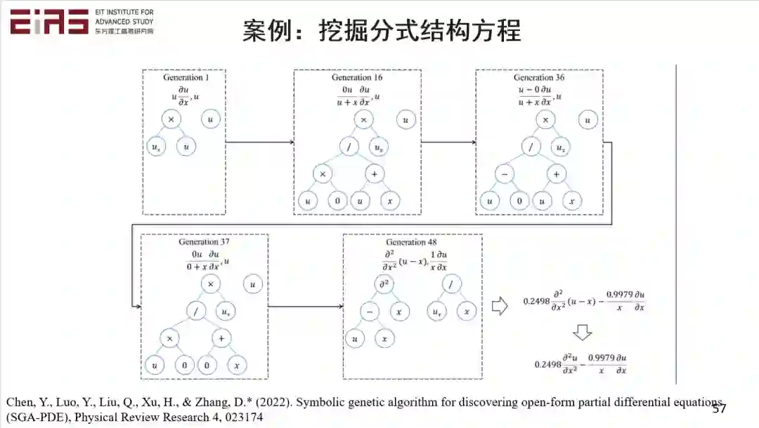 后来我们做的时候发现,实际上我们不一定知道哪项是真正有用的。这种情况下,我们给一些基本的项,其他的项,我们通过遗传算法的交叉和变异得到新的项,这叫做半开放候选集。虽然我们没有一个完备的候选集,但是我们也能解决这个问题。当然,现在更好的办法是,如果只给我一个自变量,给我一个因变量,我们再定义一些运算符、运算法则。这种情况下,如果我们能够定义像导数,加减,乘除等等这些运算符,那么方程的每一项都是一个树的结构,这样你通过一次次变异去改变树的结构,就可以把方程找出来。即使是比较复杂的方程也能找出来,而且只需要自变量和因变量。