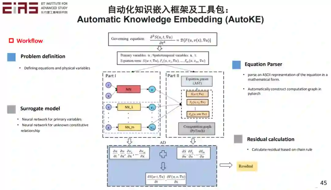 此外,在实际嵌入知识的过程中,是存在大量的难点的。尤其是当嵌入一些复杂方程的时候,比如具有分式结构或者复合函数的方程,难以直接利用神经网络的自动微分机制求梯度,因此也难以直接嵌入到人工智能模型中。此外,如前面介绍的,损失函数中各项之间的权重的确定也不是简单的问题。这方面我们最近开发了一个自动化的知识嵌入框架和工具包,叫做 AutoKE。如果大家感兴趣可以看一下我们在 IEEE Transactions on Artificial Intelligence 上发表的文章。