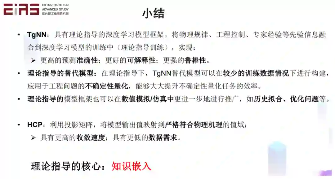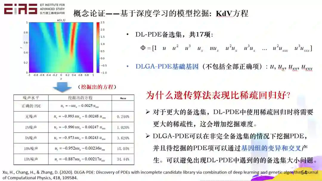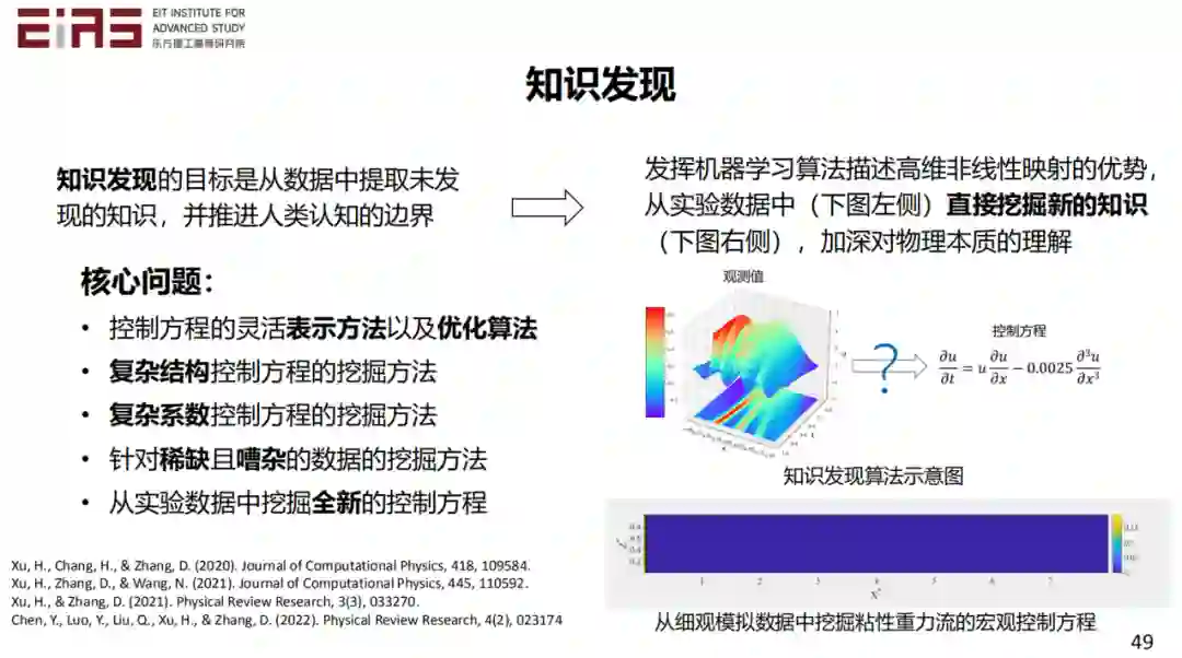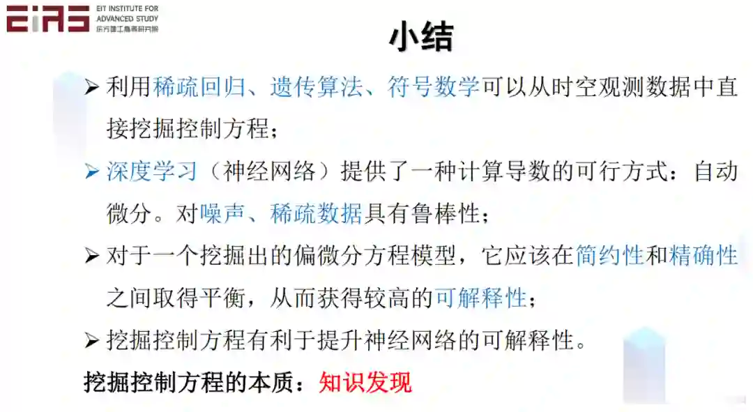 小结一下,利用稀疏回归、遗传算法、符号数学,可以从时空的数据中直接挖掘控制方程。深度学习提供了一种计算导数的可行方式,对噪声、稀疏数据具有很好的鲁棒性。对于一个挖掘出的偏微分方程模型,它应该在简约性和精确性之间取得平衡,从而获得较高的可解释性,这样的方程它实际上就找到以后就很好用,也可以给我们获得更好的可解释性。挖掘控制方程的本质就是知识发现。
