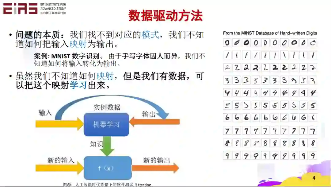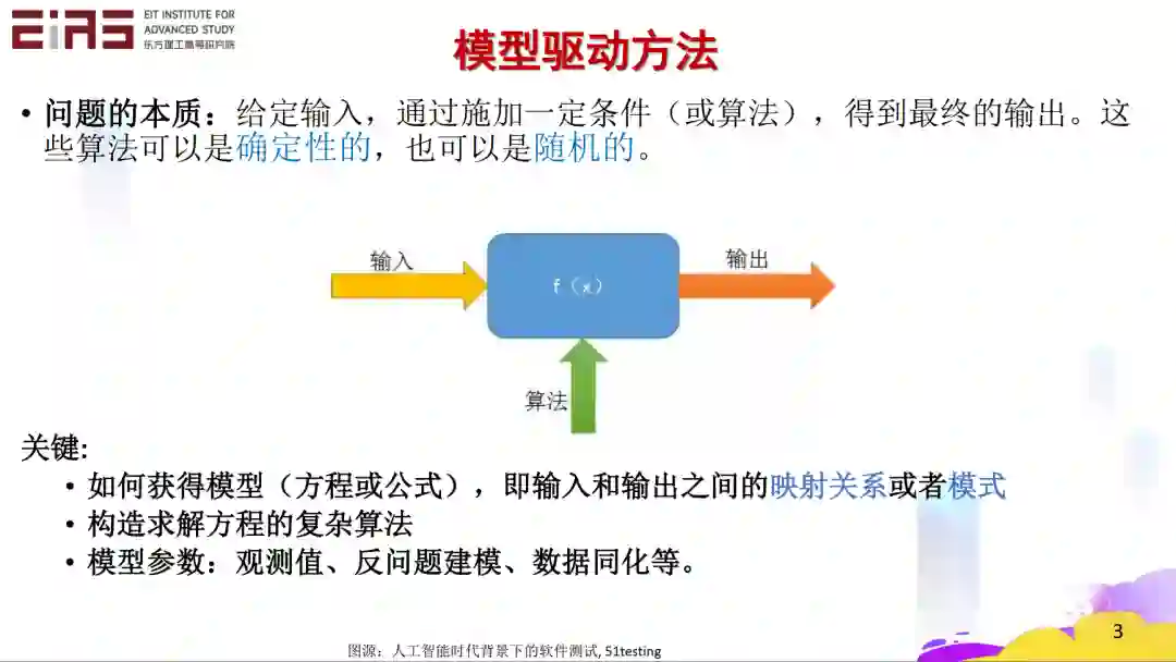 首先,大家非常清楚模型驱动的方法,经过一个模型得到一个输出。我们学编程的时候,无论是复杂的算法还是简单的算法,都是在构建一个模型,这样有一个输入就会有一个输出。当然,这个算法可以是确定的,也可以是随机的。