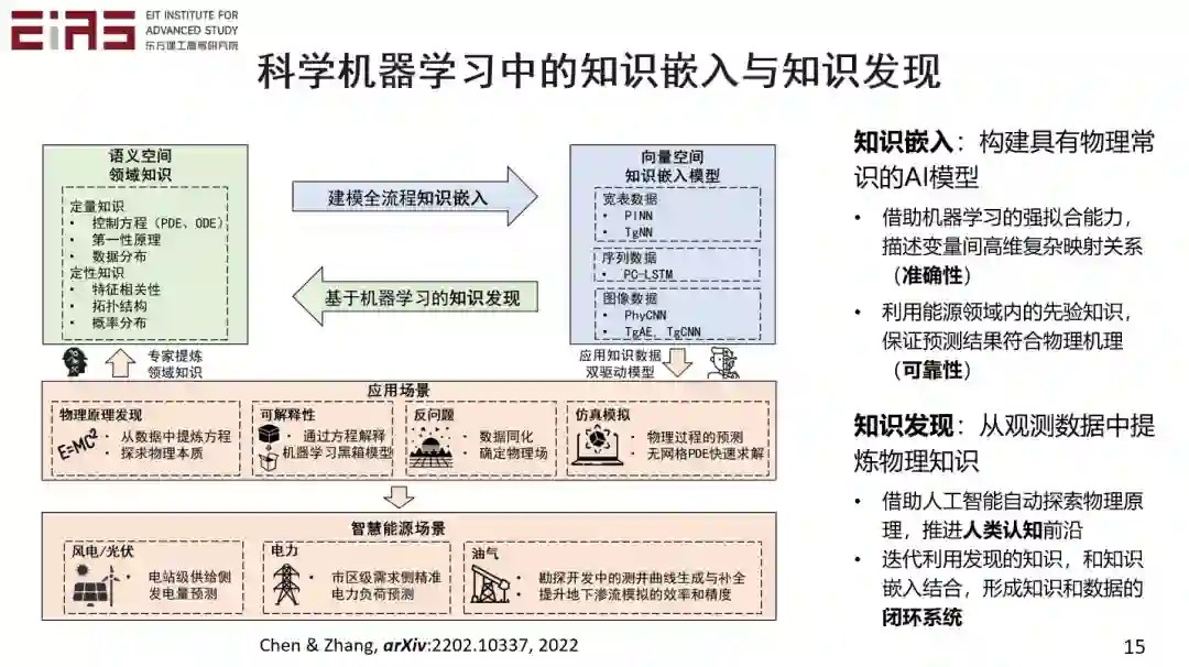 另外一方面是利用科学机器学习发现知识,也就是知识发现。知识发现是利用深度学习来探索物理原理,从观测数据或实验数据中直接挖掘控制方程,推进人类认知的前沿。知识嵌入和知识发现可以形成一个闭环,实现知识和数据的融合。