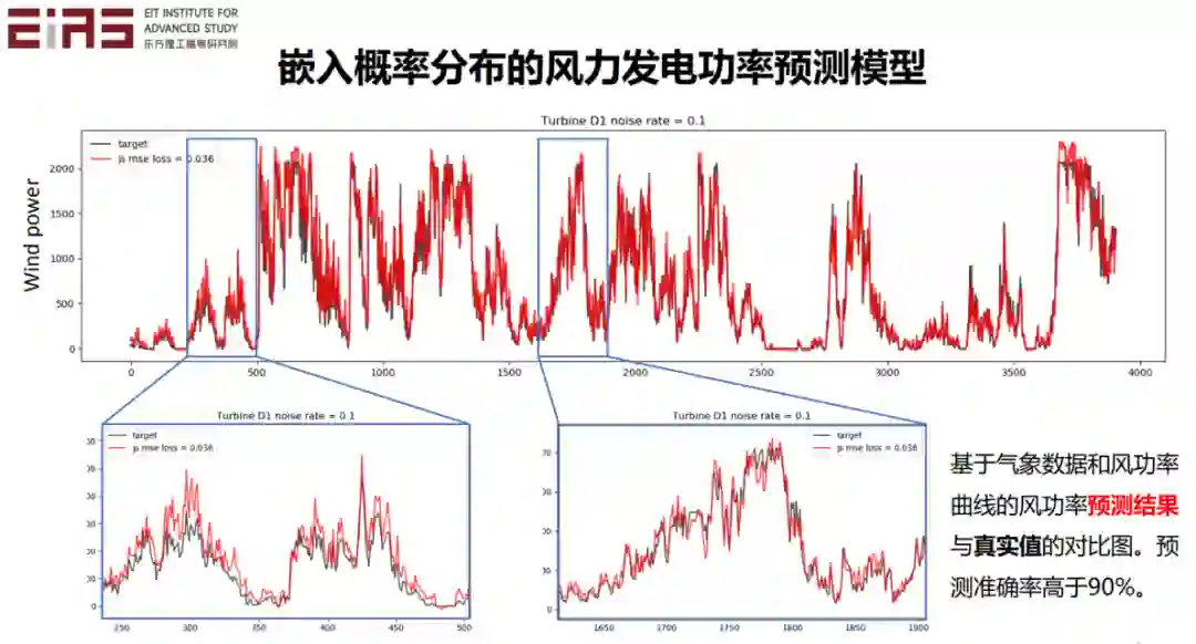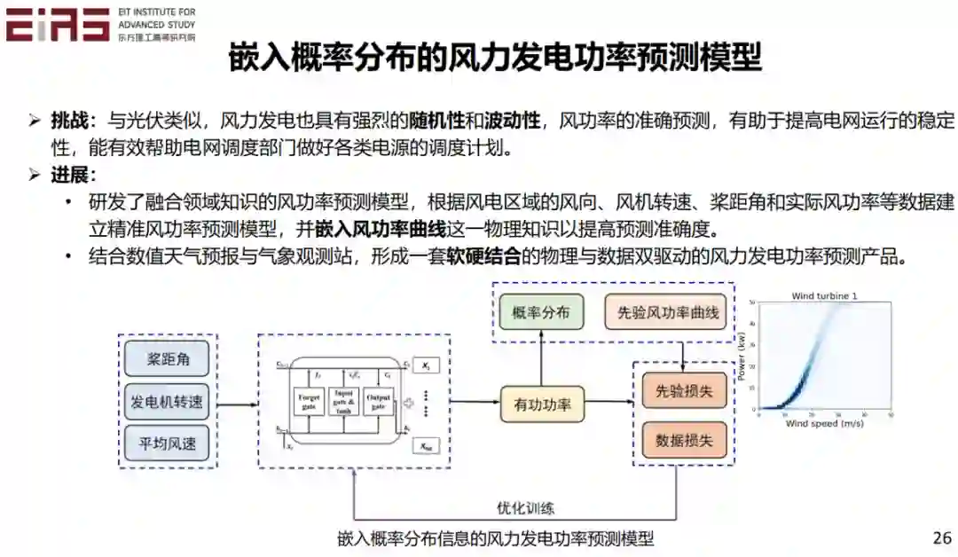 大家知道在风力发电中,风机的发电功率和风速有很大关系。由于实际工况复杂,所以该曲线并非一个一对一的映射,而是需要用描述风速和发电功率之间关系的概率分布函数来表征。如果我们有历史的数据,就可以从历史数据中得到先验的风功率曲线,然后通过改造损失函数,将其嵌入到模型的训练过程中。通过这种方法建立的人工智能模型不仅具有数据驱动的优势,还能保证输出结果符合先验的概率分布。