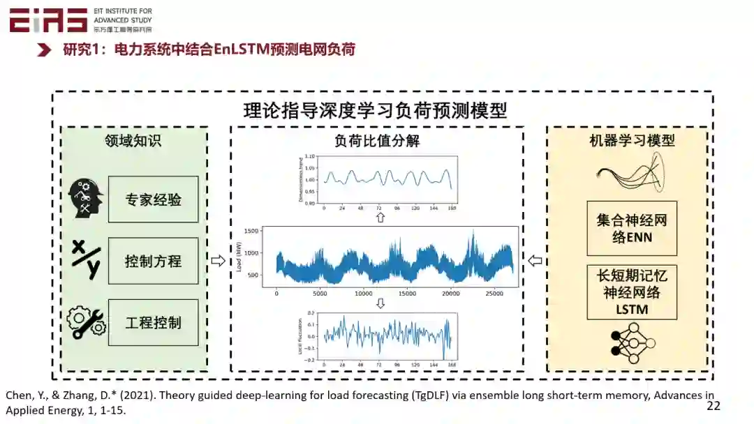 第一个例子是电力系统中电力负荷的预测。这项工作中的知识嵌入主要体现在数据的预处理方面和模型的反馈更新方面,其中数据预处理方面我们引入了一种电力负荷比值分解的方法来嵌入知识,在反馈更新环节利用一种自研的 EnLSTM 模型来优化,这种模型采用领域算法改进了优化过程。