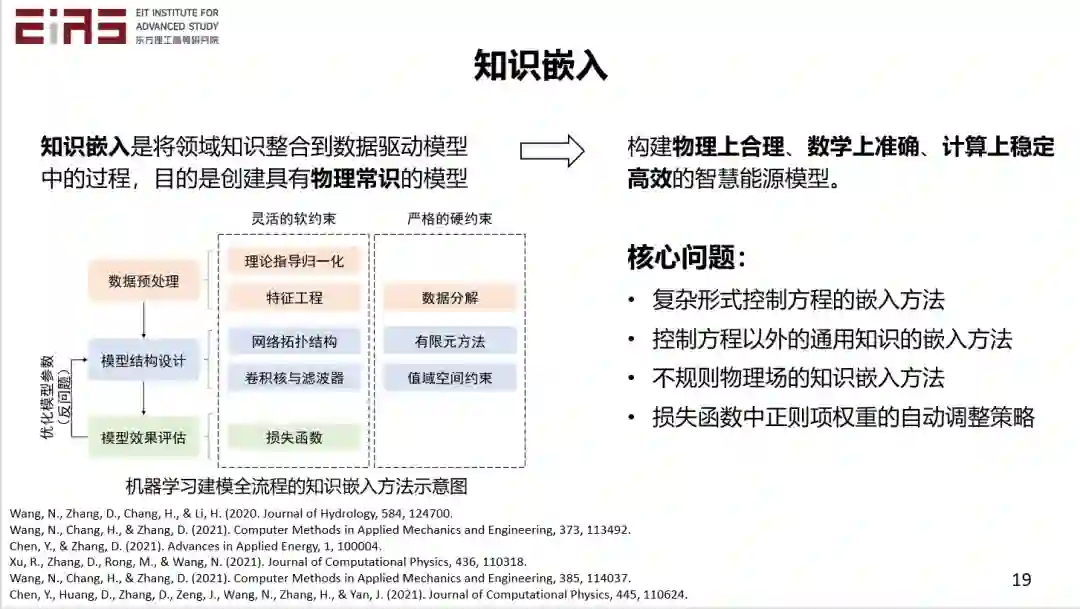 我们看看第二部分的知识嵌入。在这个过程中,既有数据,也有模型,它是两个方法之间的一个平衡。我们要兼顾二者,实现在数据驱动建模的全流程中嵌入知识。