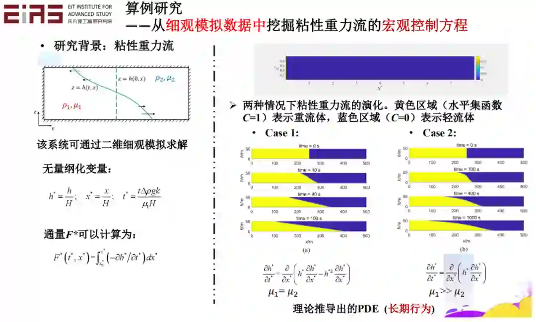 知识发现也可以用来解决实际的问题。比如这种粘性重力流问题,它的短期行为是没有控制方程的。这种情况下,我们通过精细的微观数字模拟能得到它的一些数据。是不是可以利用这些数据,来学习得到它的宏观控制方程?实际上这是可行的。