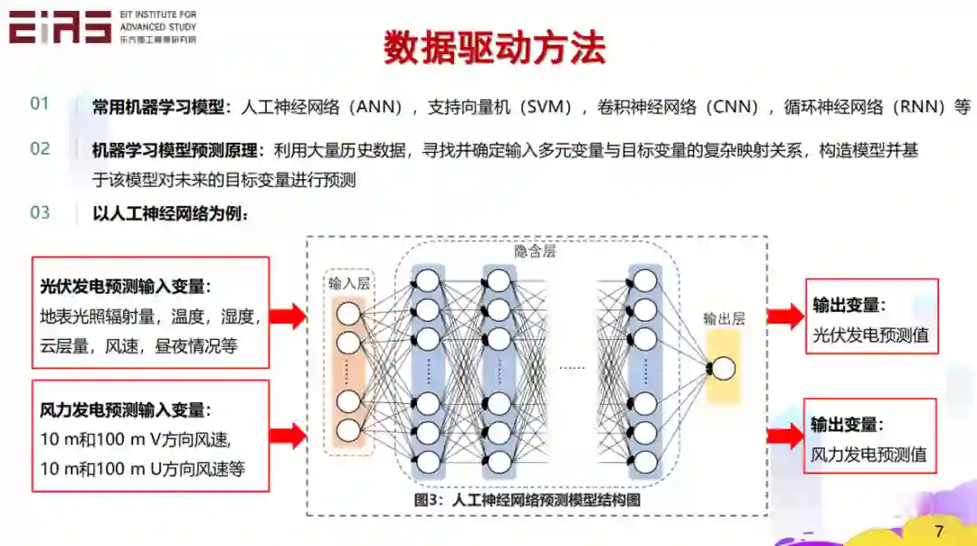 下面举几个例子,比如可再生能源的发电量的预测问题。如果我们有辐照量、温度、湿度、风速、昼夜的情况,以及历史的光伏发电量数据,就可以根据这些数据建立一种映射关系。基于此映射关系和天气预报数据,我们就能预测第二天光伏的发电量。风电也是一样。