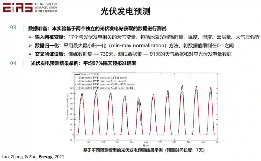 在数据预处理方面,我们把电力负荷数据分解成一个大的趋势和局部扰动,大的趋势反映了预测区域的内在模式,比如能源结构和人口结构等,是根据历史数据和专家经验来确定的。局部扰动则是系统受到天气等外驱力影响下所产生的变化,通过数据驱动模型来预测。最终,将大的趋势和小的扰动结合起来。此外,我们还采用了一种负荷比值转化的方式,以实现数据的平稳化。比值的周期是根据物理过程确定的。这个方法我就不具体展开了,大家如果感兴趣可以看我们 2021 年发表的论文 TgDLF。