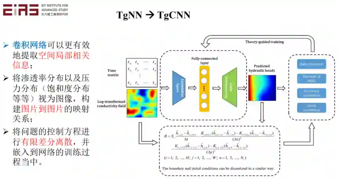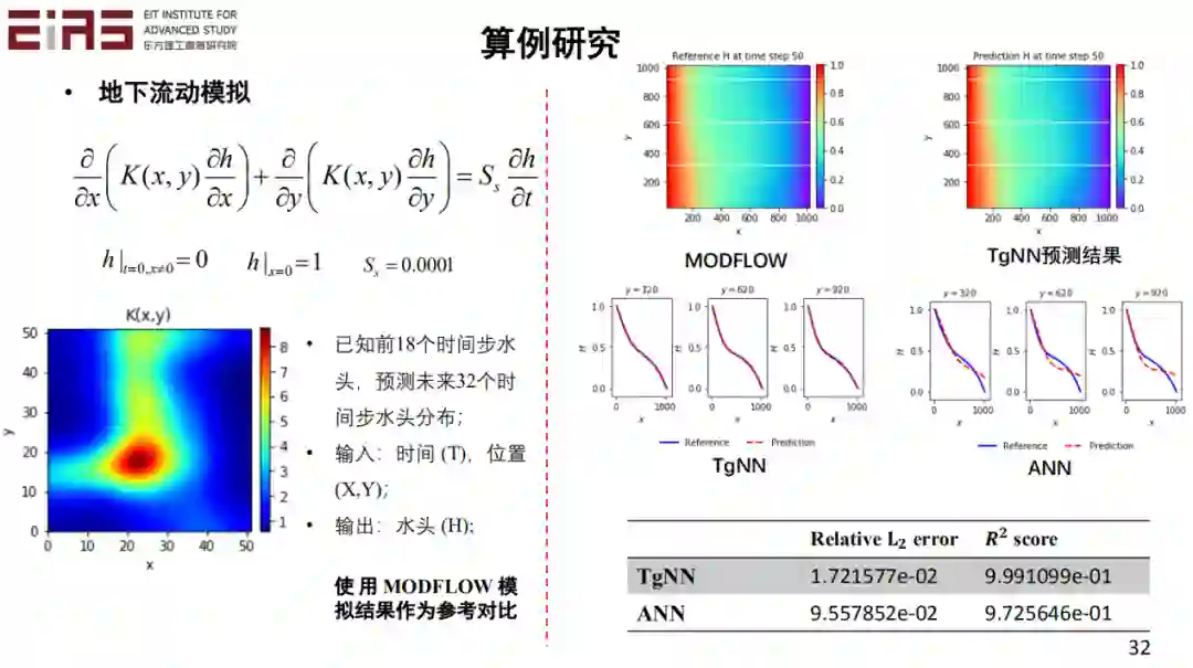 下面我们通过一系列的例子说明这个问题。比如地下水流动的问题,假设我们有最开始一段时间的数据,但是在后面改变了边界条件,即情景发生了很大变化,且没有后面一段时间的观测数据,那么常规的数据驱动模型是无法解决的。但是如果知道边界条件和控制方程,结合最开始时间的数据,就可以进行预测,且实际效果很好,如图中的对比结果。由于流场的条件已经改变了,所以开始一段时间的观测数据的数据分布已经与后一段时间不一致了,但是两段时间的数据都是受到同样的控制方程约束的,因此,如果直接用数据驱动模型预测,就会有较大误差。但是如果加入领域知识,比如控制方程和边界条件,就会有效提升模型的精度。在这个问题中,控制方程和边界条件起了很大的作用。