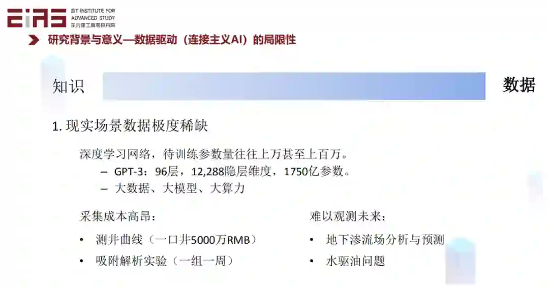 数据驱动模型在许多问题中得到了很好的效果,但是对很多应用来讲,数据是不容易获得的。比如对于地下资源勘探与开发重要的侧井曲线,打一口井进行测量可能要好几千万人民币;再比如,做一组吸附解析的实验要花很长的时间。很难获得足够的数据基于数据驱动方法对此类问题建模。