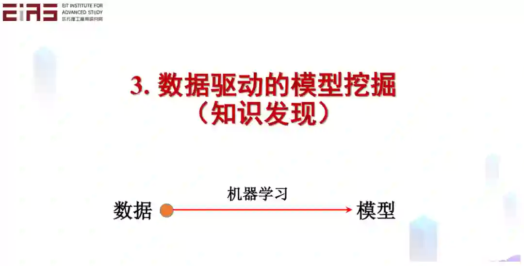 第三部分是知识驱动的模型挖掘,即知识发现。比如我们如何利用机器学习的方法从数据中直接挖掘模型,即从数据到模型。