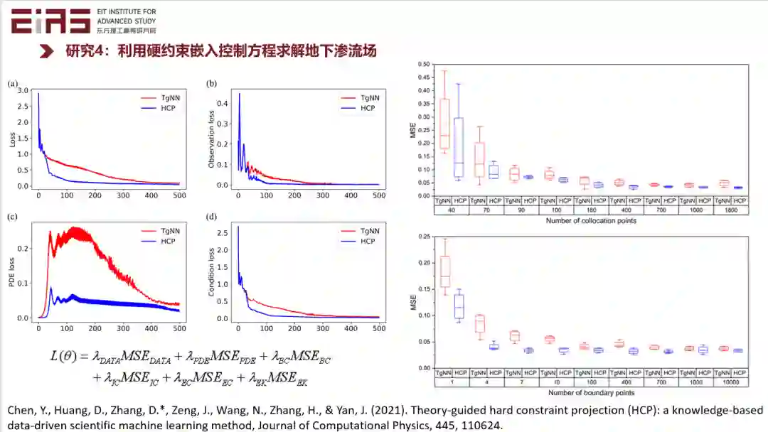 硬约束的劣势是数学上比较复杂,优势是可以保证模型在局部严格满足物理机理。刚才的软约束是保证预测结果在统计意义下满足控制方程或者其他物理机理,硬约束则是保证模型在局部严格满足物理机理,这样实际上它效果是可以更好的。如果大家感兴趣,可以参考我们发表的 Hard constraint projection (HCP) 模型。但是时间关系我就不细说了。