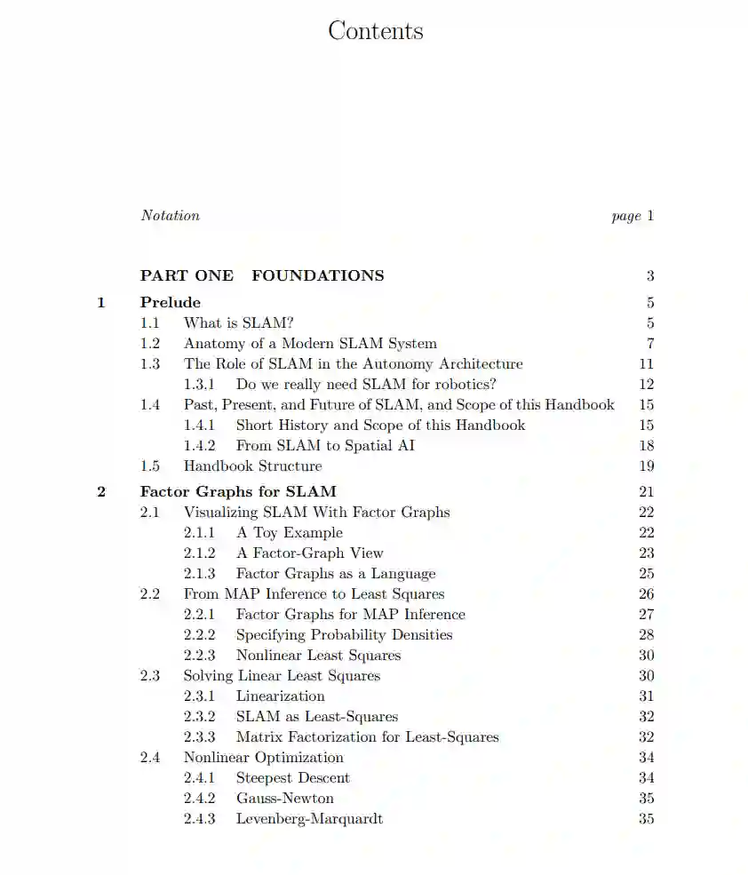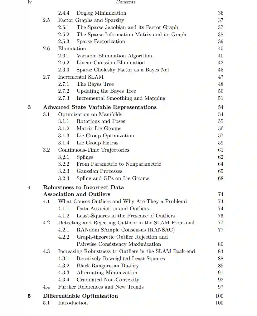 第一部分涵盖SLAM的基础知识,特别关注用于SLAM后端的估计理论工具和SLAM可以生成的不同类型的地图表示。具体来说: * 第2章 介绍SLAM的因子图表示,并回顾如何通过迭代非线性优化方法求解。 * 第3章 迈出了不可或缺的一步,将该表示扩展到平滑流形上的变量估计,例如旋转和位姿。 * 第4章 讨论了如何在SLAM后端中建模和缓解异常值和数据关联错误的影响。 * 第5章 回顾了使后端优化可微分的技术,这是连接传统SLAM方法与最新深度学习架构的关键步骤。 * 第6章 将重点从后端转移到密集地图表示的问题,讨论SLAM中最重要的表示方法。 * 第7章 讨论了更高级的求解器和SLAM后端的理论属性。