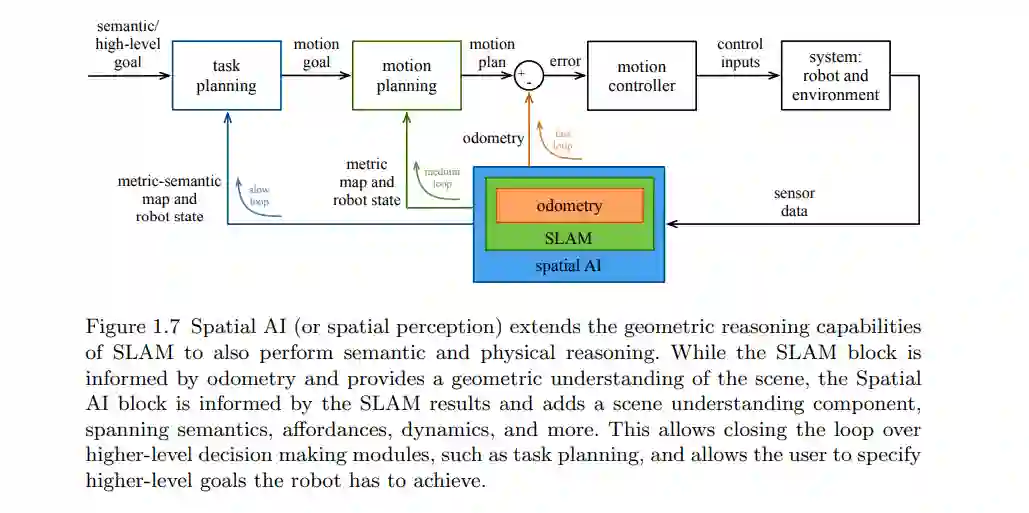 SLAM 的核心关注点是估计环境(以及机器人)的几何特性。例如,SLAM地图包含有关环境中障碍物的信息、两个位置之间的距离和可通行路径,以及显著地标的几何坐标。从这个意义上说,SLAM作为一种表示方式,对于机器人理解和执行诸如“机器人:前往位置[x, y, z]”这样的命令非常有用,其中[x, y, z]是机器人需要到达的地点或物体在地图坐标系中的坐标。 然而,用坐标指定目标对于非专业的人类用户来说并不合适,也绝不是我们与人类互动或为其指定目标的方式。因此,希望下一代机器人能够理解和执行以自然语言指定的高级命令,例如:“机器人:把浴室里的衣服捡起来,送到洗衣房。”解析这些指令要求机器人同时理解环境的几何信息(例如,浴室在哪里)和语义信息(例如,什么是浴室或洗衣房,哪些物体是衣服)。 这种认识最近促使研究界开始将 SLAM 视为更广泛的空间感知系统的一个组成部分。这个系统可以同时推理场景的几何、语义以及可能的物理特性,从而构建一种多层次的地图表示(即“世界模型”),使机器人能够理解并执行复杂的指令。由此产生的空间人工智能(Spatial AI)算法和系统有望显著提高机器人的自主能力,并在过去十年中迅速发展。 直观地说,可以认为空间人工智能将SLAM作为一个子模块(处理几何推理部分),但增加了额外的语义推理能力。这使得机器人能够完成任务规划的闭环,如图1.7所示,现在机器人可以接受高级语义目标,而不是运动目标的坐标。我们将在本手册的第III部分详细讨论空间人工智能。