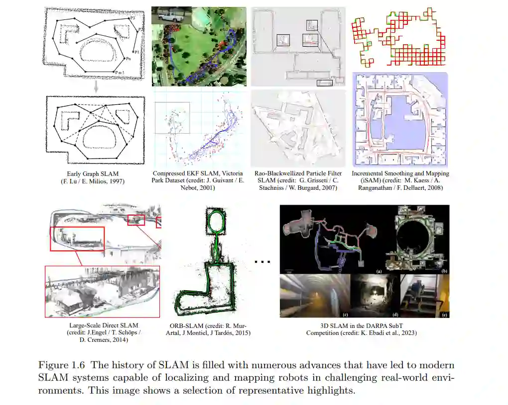 正如本书各章讨论的那样,SLAM具有多种面向。因此,其历史也是多方面的,可以追溯到不同的科学领域。 从观测和测量中创建世界地图是历史上最古老的挑战之一,这导致了大地测量学(测量地球性质的科学)和测绘学的产生。许多先驱者为这一领域做出了贡献。卡尔·弗里德里希·高斯在1821年至1825年间对汉诺威王国进行了三角测量。乔治·埃佛勒斯特爵士在1830年至1843年期间担任印度大三角测量总督,因而世界上最高的山峰以他的名字命名。1856年,卡尔·马克西米利安·冯·鲍恩芬德出版了一本关于《测绘元素》的标准著作,并于1868年创立了慕尼黑工业大学,重点推动将大地测量学确立为一门科学学科。安德烈-路易斯·柯列斯基在第一次世界大战前在克里特岛和北非进行测绘时,发展了著名的柯列斯基矩阵分解法。 视觉SLAM问题与摄影测量学以及计算机视觉中的运动结构重建问题密切相关,其起源可以追溯到19世纪(详见第8章)。 在机器人学中,SLAM的起源通常追溯到Smith和Chessman [239]以及Durrant-Whyte [79]的开创性工作,以及Crowley [60]和Chatila与Laumond [48]的平行研究。SLAM这一缩写于1995年在综述论文[80]中首次提出。这些早期工作提出了两个基本见解。第一个见解是,在未知环境中,为了避免漂移,必须同时估计机器人的位姿和固定外部实体(例如地标)的位置。第二个见解是,可以利用估计理论中的现有工具,特别是著名的扩展卡尔曼滤波器(EKF),在描述机器人位姿和地标位置的扩展状态上进行估计,从而形成EKF-SLAM方法。