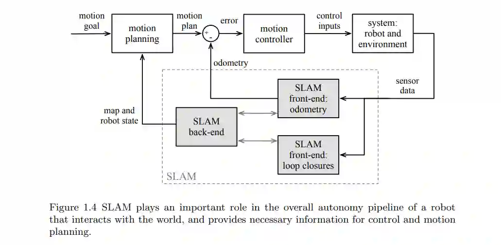 本章介绍了同步定位与建图(SLAM)问题,展示了构成典型SLAM系统的模块,并解释了SLAM在自主系统架构中的作用。本章还对该主题提供了简短的历史回顾,并讨论了传统SLAM概念如何随着新技术趋势和机遇的出现而不断发展。本章的最终目标是引入基本术语和动机,并描述本手册的范围和结构。