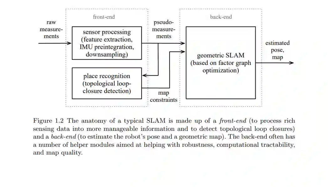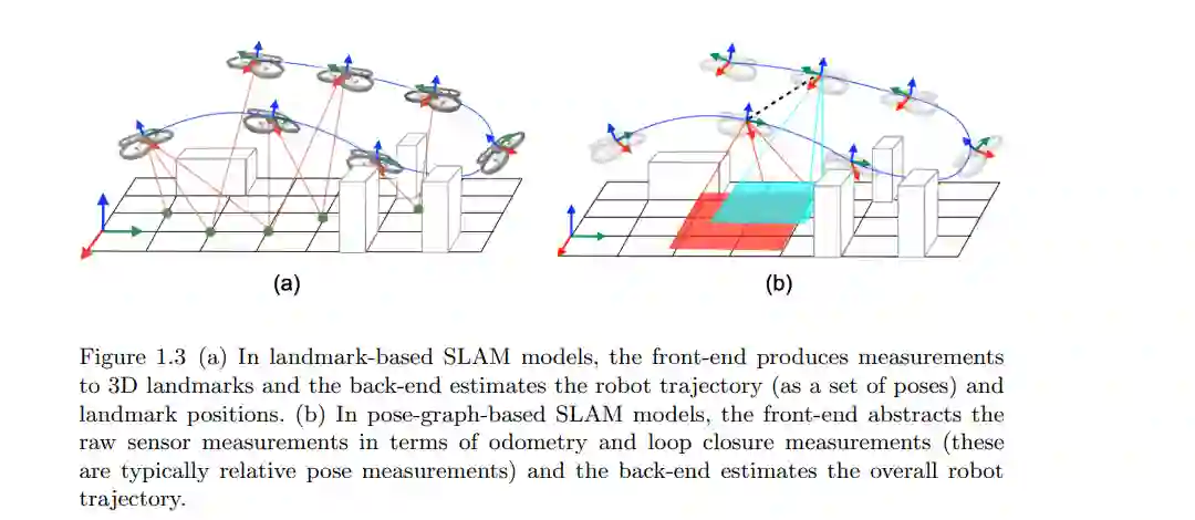 上述示例展示了 SLAM 系统前端生成并传递给后端的三种常见“中间表示”(或伪测量)(图 1.2):地标观测、里程计和回环检测。在复杂的 SLAM 系统中,这些表示可以组合使用。例如,在某些视觉 SLAM 系统中,可以提取对应于三维地标的关键点,并进一步处理它们以计算对应于里程计和回环检测的相对位姿,最终使用基于位姿图的后端。前端和后端的划分需要在计算效率和精度之间做出权衡。提取更简单的表示可以显著加快后端求解器的速度(例如,执行位姿图优化通常比束调整快得多);但同时,对测量值的抽象会在后端的测量建模中引入近似,从而导致一定程度的小误差(例如,束调整通常比位姿图优化更精确)。