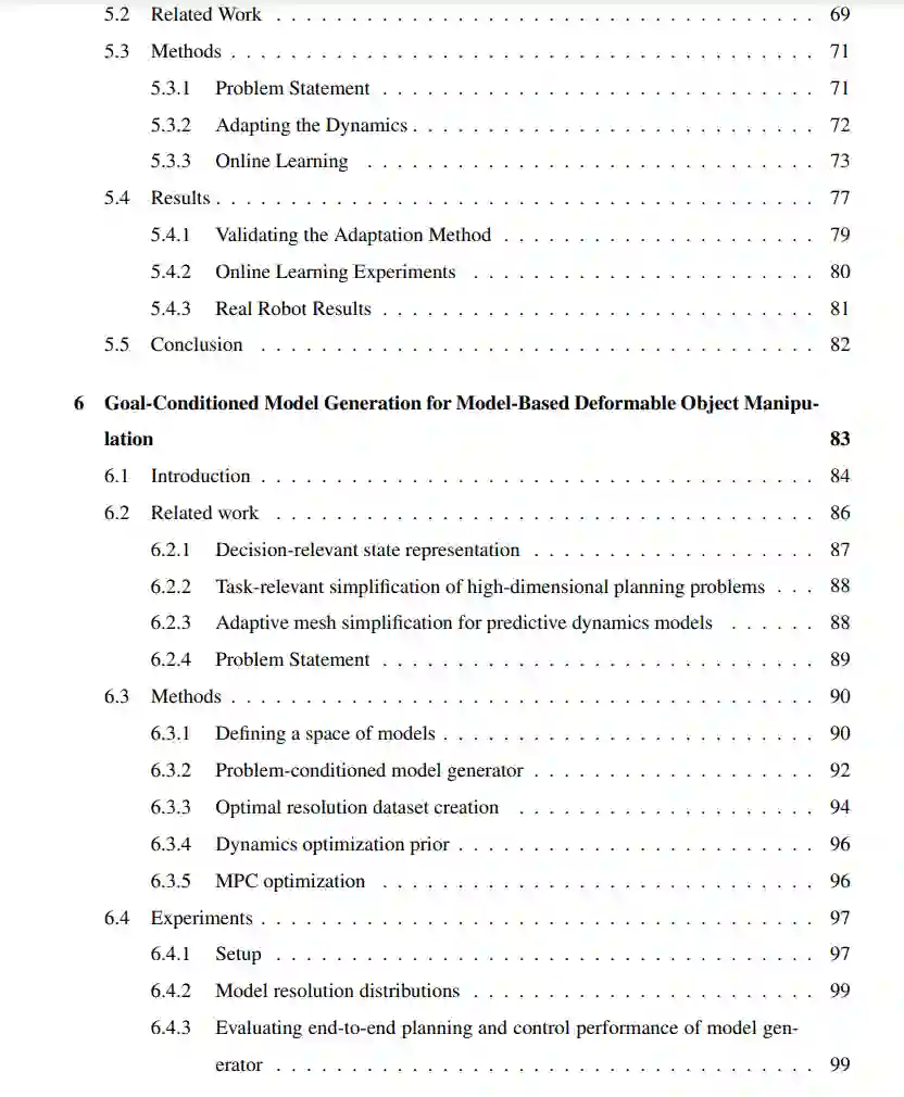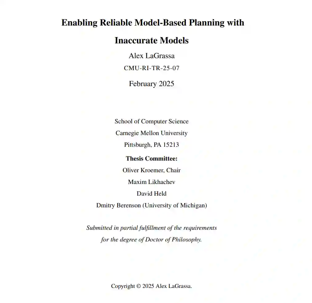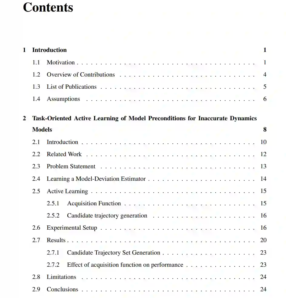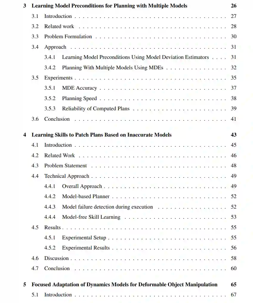 本论文的目标是提供一个框架,用于结合多种互补工具,使机器人能够利用不同形式的知识来操控物体。我们考虑了多种类型的知识,例如基于物理的模型、学习到的动力学模型,以及从人类示范中学习的无模型技能。每种知识形式都带有其对世界的假设以及所需的资源。我们主要通过基于模型的规划视角来解决利用知识进行决策的问题,即机器人使用预测模型来选择能够实现预期结果的动作。尽管预测模型被广泛用于任务和运动规划,但在许多情况下,其预测结果可能与现实世界的行为存在偏差,从而导致任务失败甚至损坏。尽管所有模型都存在局限性,但本论文认为,如果能够正确考虑模型的局限性,即使模型非常不准确,它们仍然是有用的。我们考虑了多种形式的模型不准确性,包括模型在表示能力上的结构性限制。在此框架内,我们试图通过学习模型与现实之间的差异来扩展机器人的能力。具体来说,我们学习并使用状态-动作空间中的区域,称为模型前提条件,在这些区域中,模型能够可靠地表示现实世界的动力学。量化模型前提条件可以在获取新任务知识时高效地扩展能力。由于通过新数据(例如人类示范或在现实世界中尝试可能不安全的动作)获取知识的成本可能很高,因此效率至关重要。通过使用预测准确性定义模型前提条件,我们表明,即使使用极少的数据,任务可靠性也可以显著提高。通过学习模型偏差估计器(MDE),我们可以将规划限制在模型准确的区域内,从而提高规划的可靠性。尽管模型前提条件的MDE公式可以从现有数据中学习,但我们提出了一种主动学习模型前提条件的方法(第2章)。随后,论文介绍了利用模型前提条件扩展机器人能力的算法。其中一种方法支持使用多种形式不同且计算需求各异的模型进行规划,从而实现更高效的规划和可靠的执行,同时保留最优性的理论保证(第3章)。我们还解决了现有模型不足以解决问题的情况。首先,我们展示了一种将无模型技能整合到基于模型规划中的方法,且数据需求较低(第4章)。其次,我们提出了一种动力学适应算法,能够高效选择并更新学习到的动力学模型的数据,从而将能力扩展到更复杂的动力学场景(第5章)。对量化和扩展机器人能力的探索引发了一个根本性问题:对于特定任务,可靠的规划和控制真正需要什么样的模型?针对这一问题,我们提出了一种算法,能够在给定规划问题的情况下生成高效且可靠的动力学模型(第6章)。本论文的目标是为结合多种形式的知识进行决策提供基础,指导设计能够利用不同工具解决任务的机器人系统。
