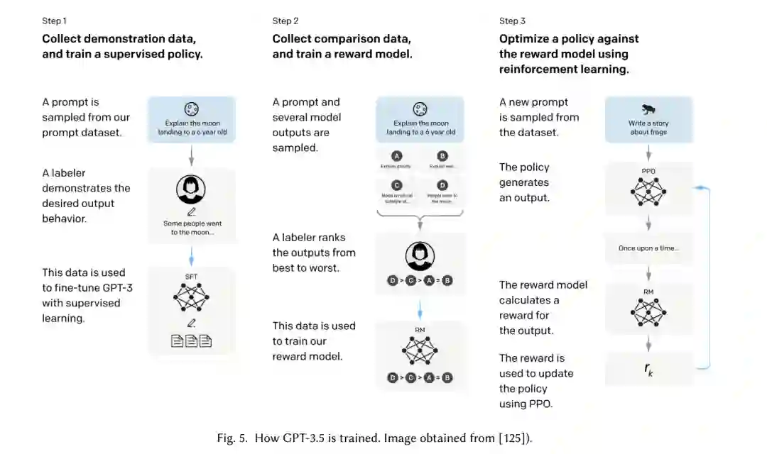GPT-3.5。GPT-3.5是广泛流行的GPT-3的变体,ChatGPT是GPT-3.5的微调版本。在GPT-3模型之上,GPT-3.5具有额外的微调程序:有监督的微调和人工反馈的强化学习(RLHF)[203],如图5所示,其中机器学习算法接收用户反馈并使用它们来对齐模型。RLHF用于克服传统无监督和有监督学习只能从无标记或有标记数据中学习的局限性。人工反馈可以采取不同的形式,包括惩罚或奖励模型的行为,为未标记的数据分配标签,或更改模型参数。通过将人工反馈纳入训练过程,GPT-3.5的可用性显著提高。