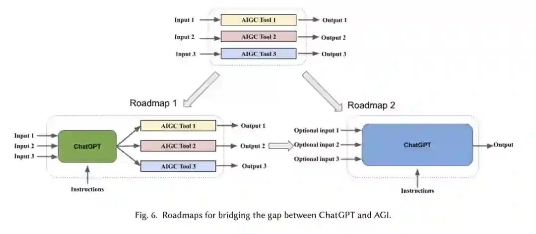 实现这样的通用AIGC的一种天真的方式是,以并行的方式将各种AIGC工具集成到一个共享agent中。这种朴素方法的一个主要缺点是不同的AIGC任务之间没有交互。在查阅了大量文章后,我们推测可能存在两种将ChatGPT桥接并推向AGI的路线图。因此,我们主张一个共同的景观,实现多元化AIGC模式之间的互联互通。
