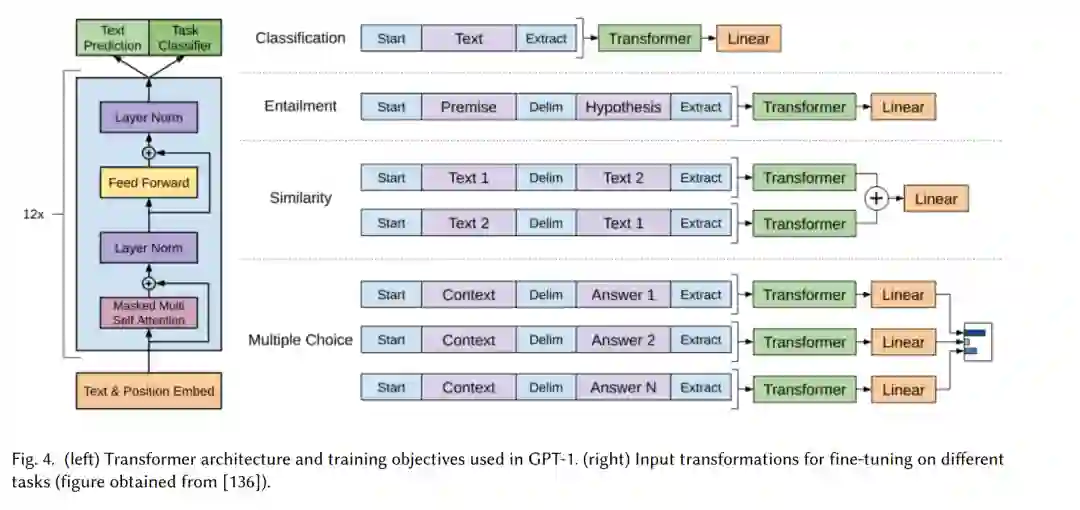 GPT-1。在只有解码器的情况下,GPT-1采用了12层的Transformer,具有117M的参数[136]。图4展示了GPT-1的概述以及如何将其用于各种下游任务。在包含独特未出版书籍的大型BooksCorpus数据集上进行训练,GPT-1能够掌握长程依赖关系的上下文。一般任务无关的GPT模型在12个任务中的9个中优于为特定任务训练的模型,包括自然语言推理、问答、语义相似性和文本分类[136]。观察到GPT-1在各种零样本任务上表现良好,表明了高水平的泛化能力。在GPT-2发布之前,GPT-1已经发展成为用于各种NLP任务的强大模型。