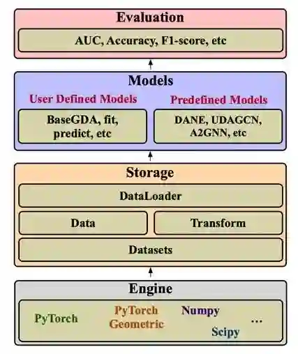 PyGDA简介 总的来说,PyGDA拥有一下几个特性: 1.覆盖图域自适应的完整流程:包括数据预处理、模型训练、评估等全流程操作,还支持在大图上的批量与采样式训练;