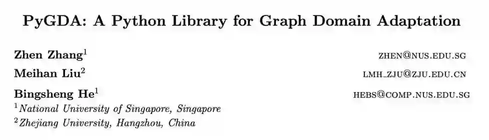 参考文献: [1] Liu M, Zhang Z, Tang J, et al. Revisiting, benchmarking and understanding unsupervised graph domain adaptation[J]. Advances in Neural Information Processing Systems, 2024, 37: 89408-89436. [2] Zhang Z, He B. Aggregate to Adapt: Node-Centric Aggregation for Multi-Source-Free Graph Domain Adaptation[C]//Proceedings of the ACM on Web Conference 2025. 2025: 4420-4431. [3] Zhang Z, Liu M, He B. PyGDA: A Python Library for Graph Domain Adaptation[J]. arXiv preprint arXiv:2503.10284, 2025.